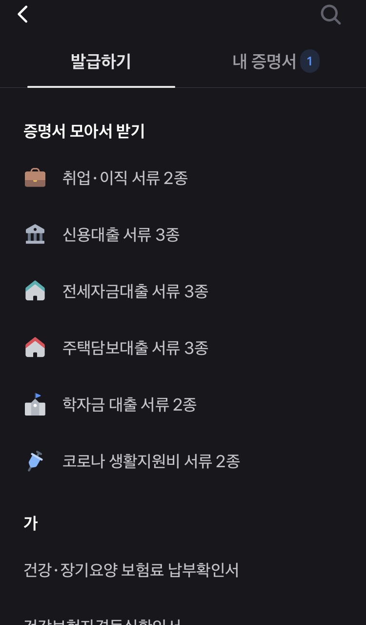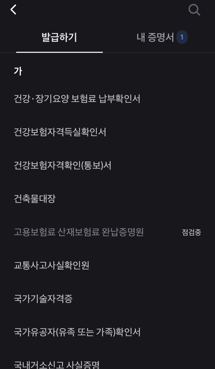 발급가능한 메뉴가 아래로 가나다 순으로 쭉 정리되어 있다.