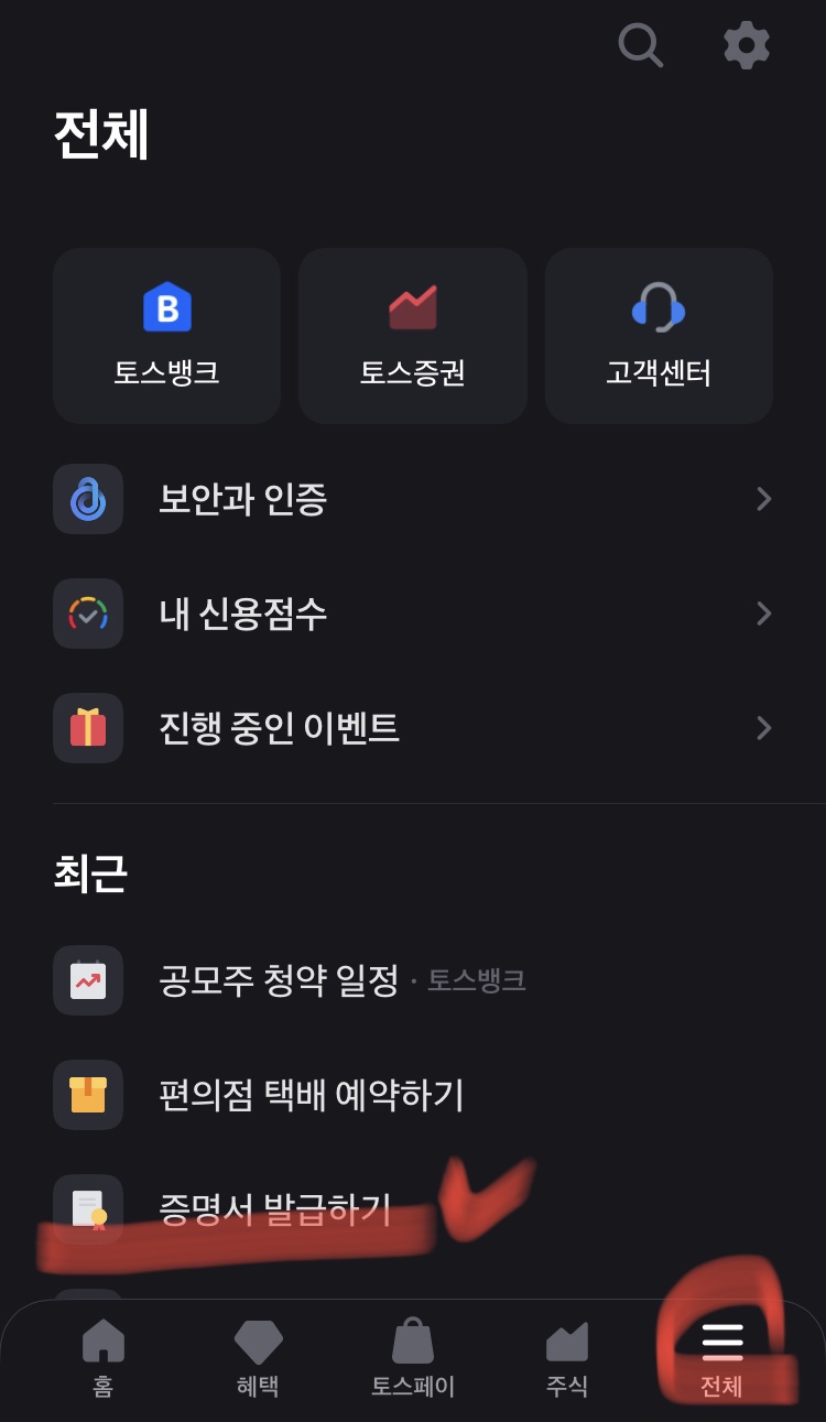 토스뱅크 증명서발급하기 메뉴에서 급 발급받았는데 아주 간편해서 좋았다.