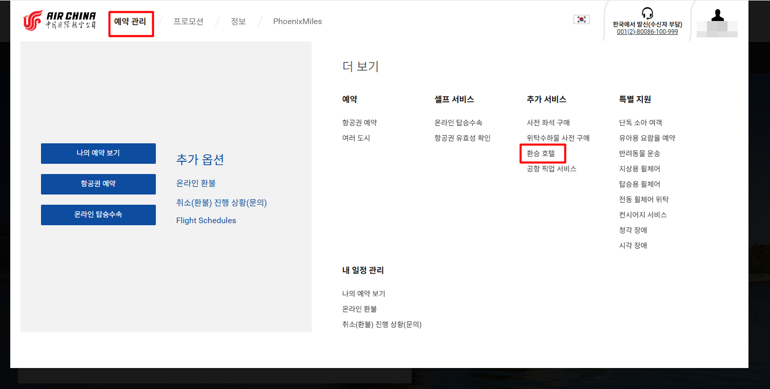 - 온라인 셀프 예약 : 에어차이나 공식 홈페이지 또는 모바일 앱( 예약관리 → 부가 서비스 → Transit Hotel 선택 )