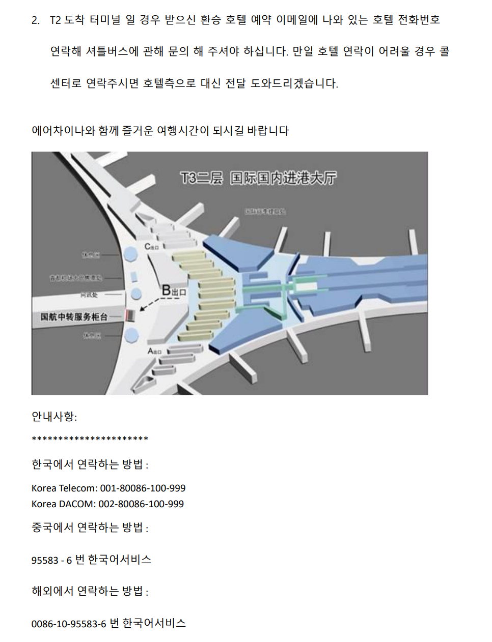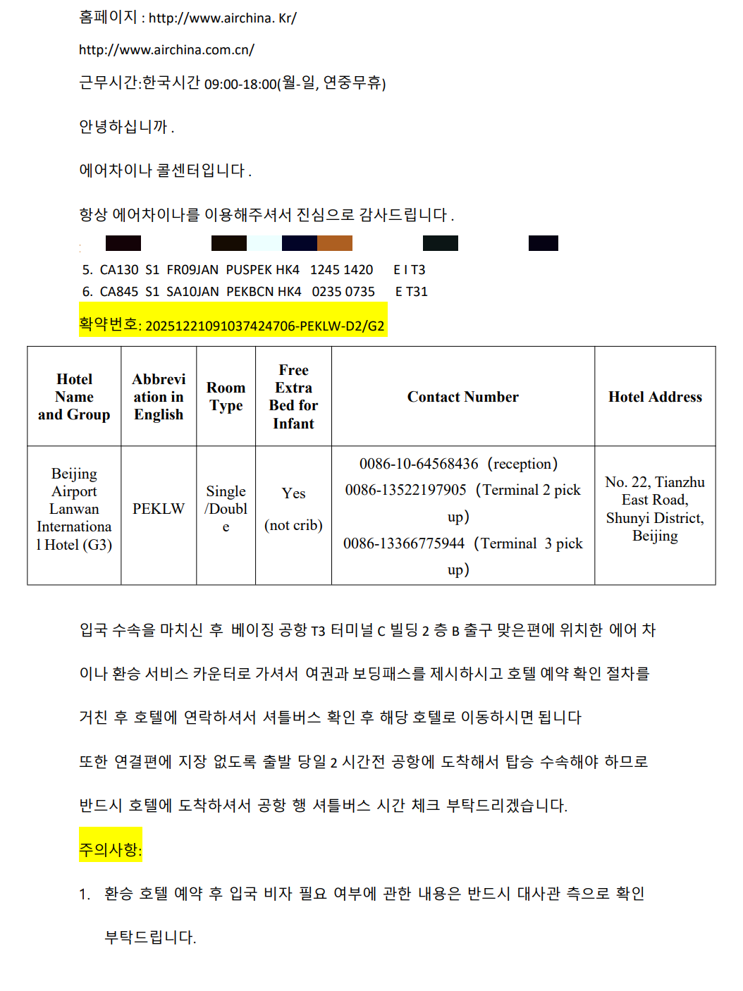 에어차이나(AIR CHINA) 베이징(북경) 경유 무료 환승호텔(트랜짓 호텔) 예약 을 완료했는데,