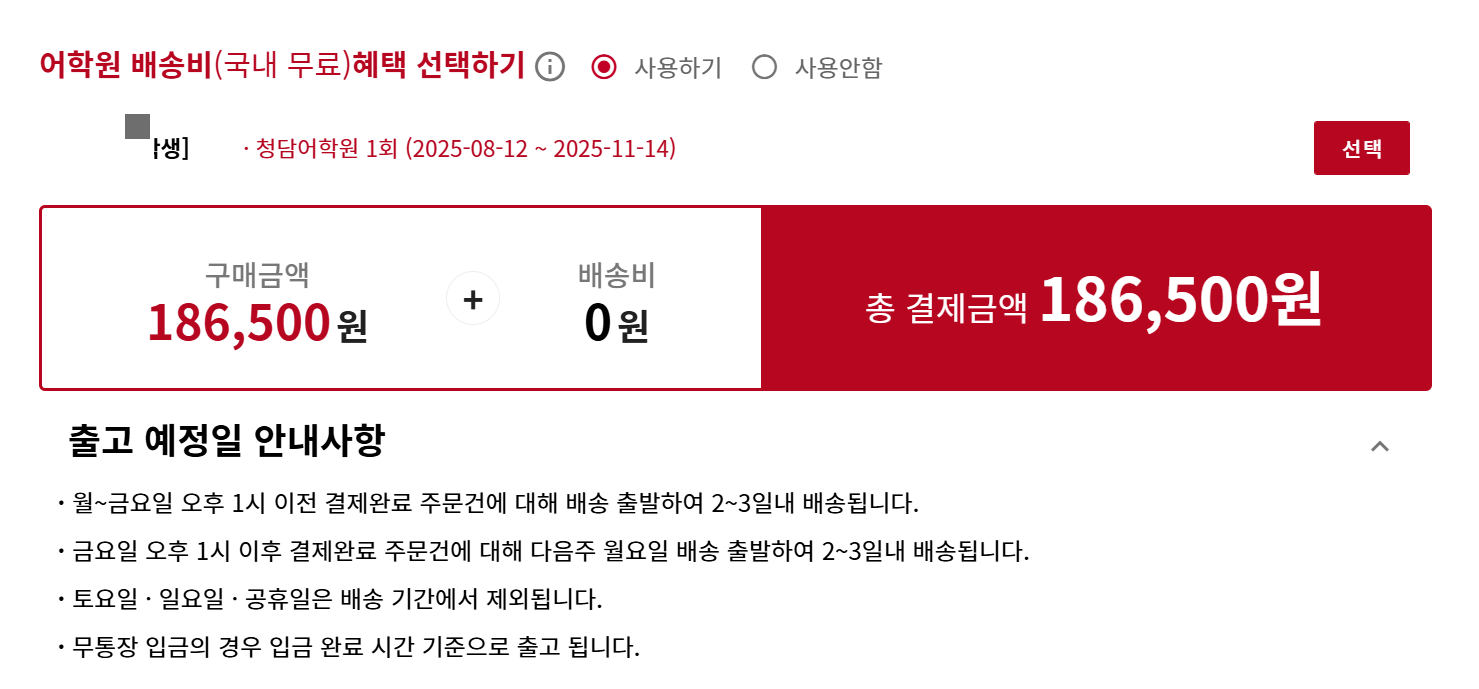 다음 학기 3개월 교재 186,500원 결제.