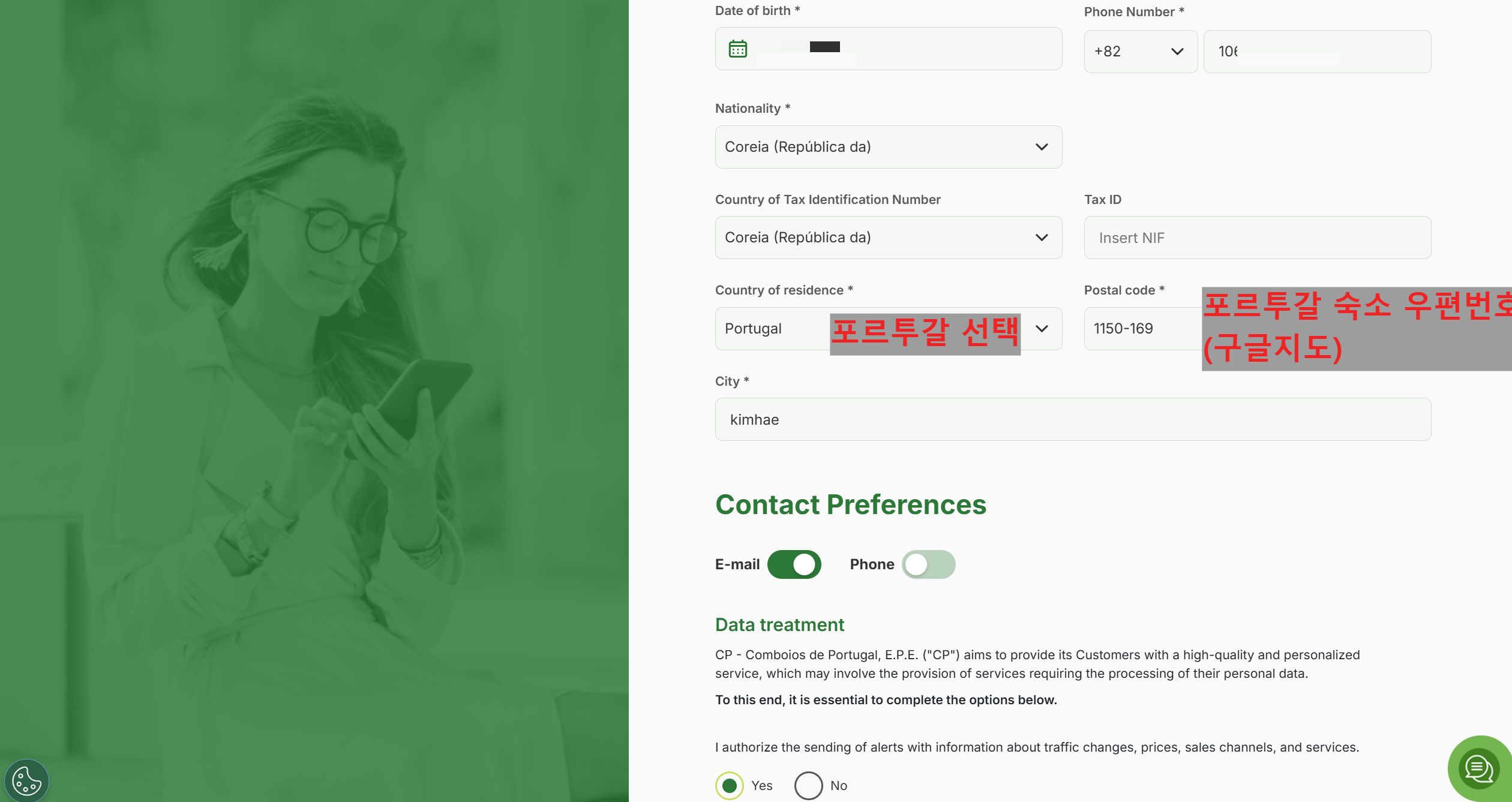 country of residence 포르투갈로 선택, postal code 도 포르투갈의 우편번호를 넣었다.