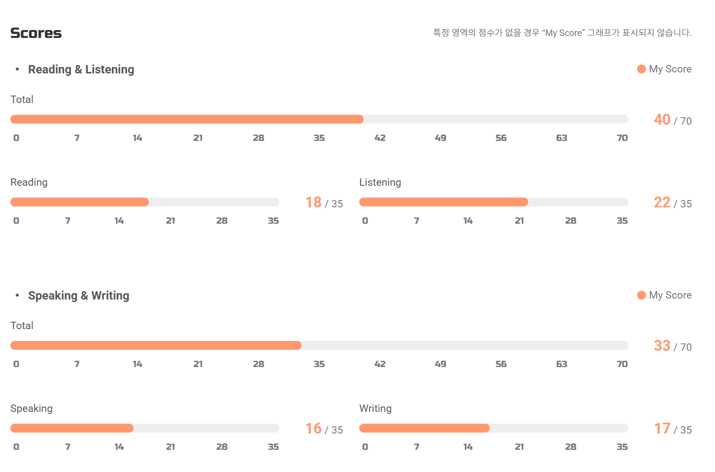 스피킹과 라이팅은 절반도 넘지 못했다. 둘째는 말하고, 쓰는데 취약할 것이라 예상은 했다.