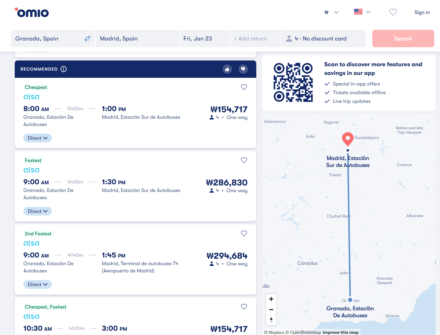 오미오(OMIO)에서 그나라다 출발, 마드리드 도착 편으로 조회를 해보니