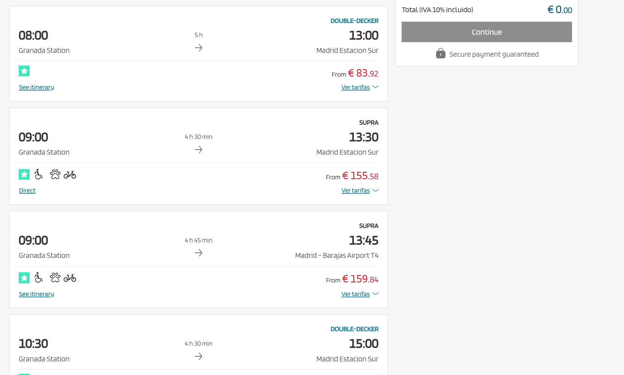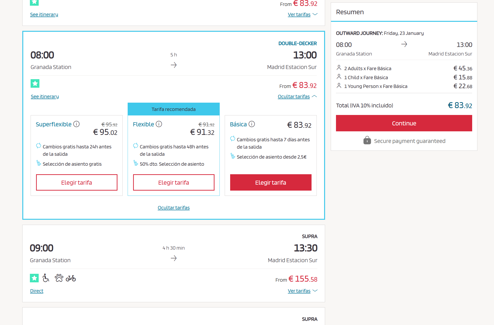 그라나다에서 마드리드까지 성인 2명, 만 12세, 만 10세 1명 4인 가족 하니 83.92유로