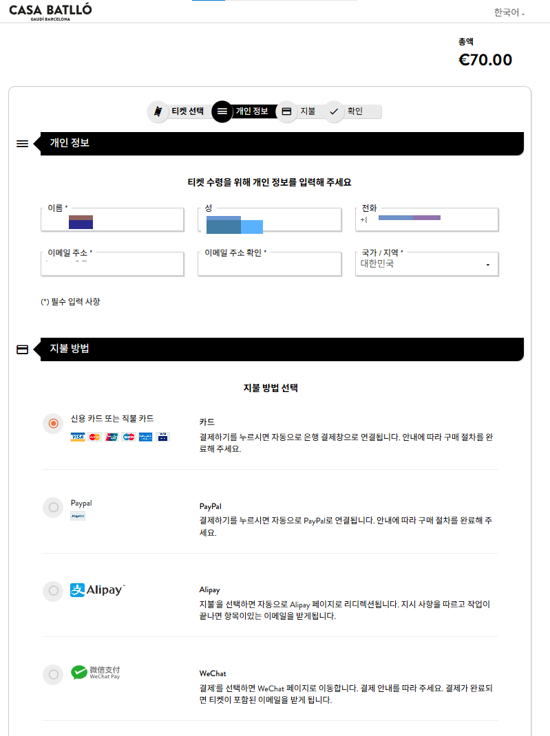 신용카드 결제하고, 까사바트요 내부입장 예약 완료.