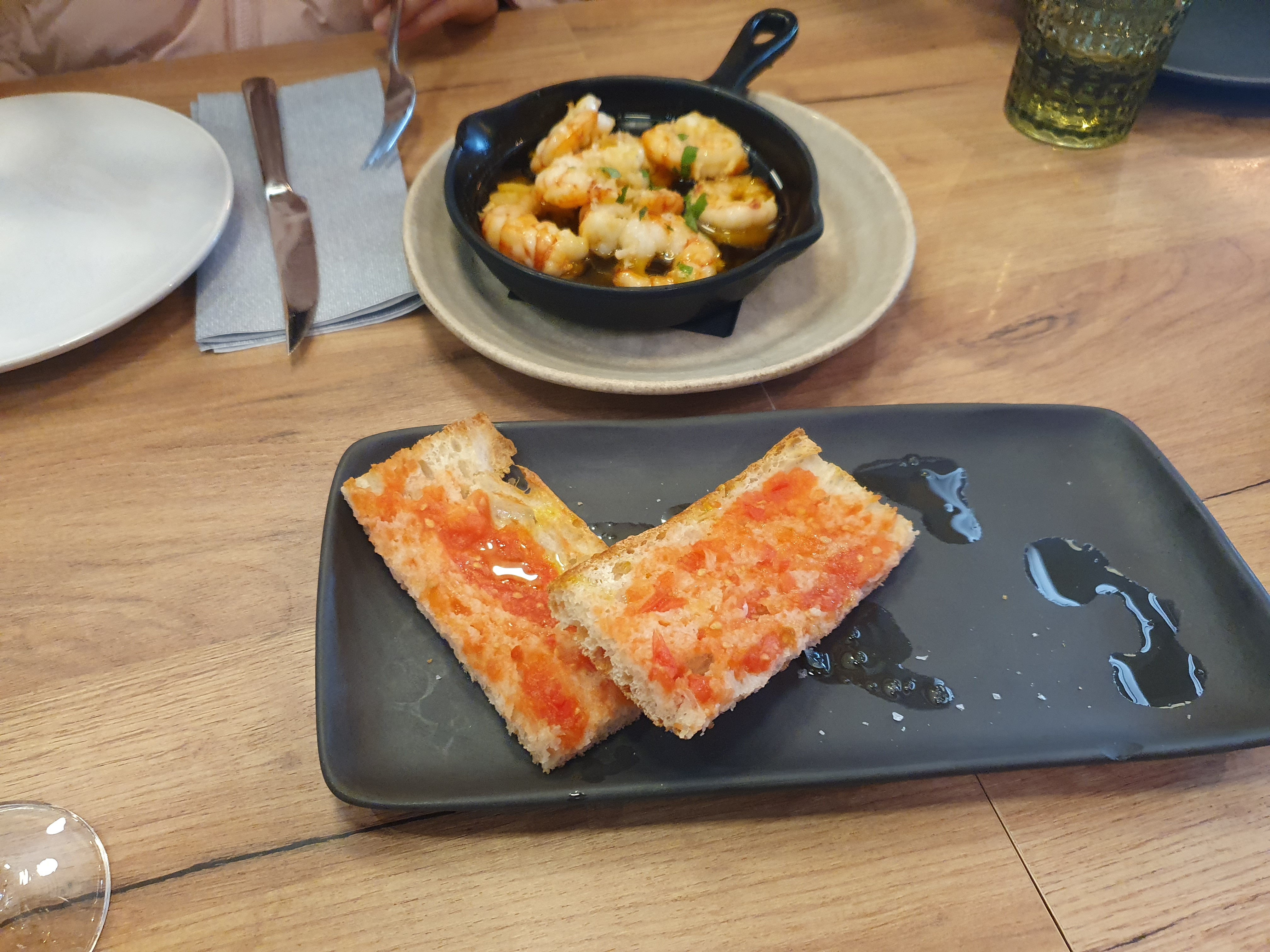 올리브 오일에 풍덩 빠진 새우 올려 먹으면 맛있다.