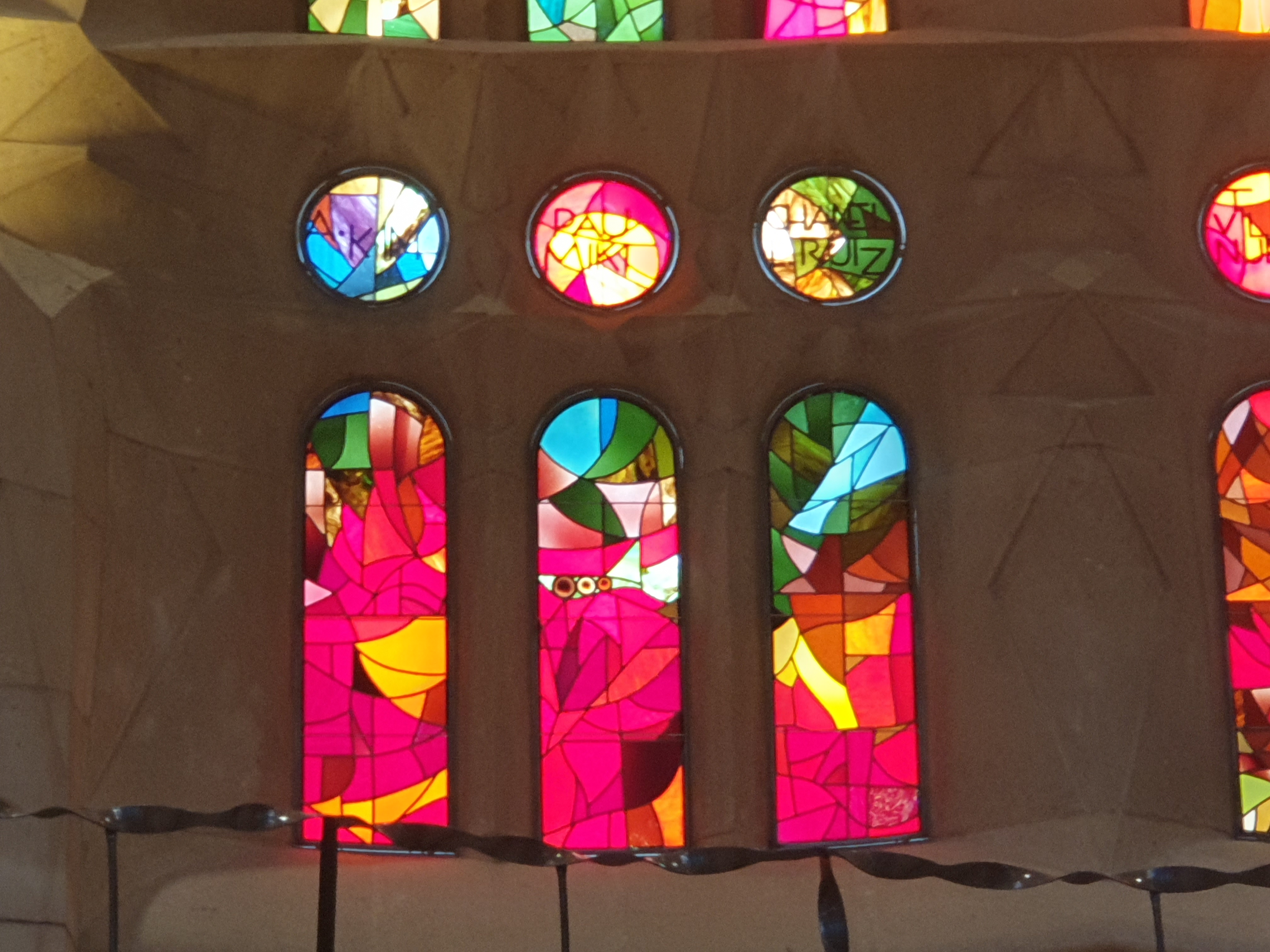 동쪽 (탄생의 파사드 쪽): 푸른색과 녹색 계열의 유리창입니다. '탄생과 희망'을 상징하며, 아침 햇살이 들어올 때 생동감을 줍니다.