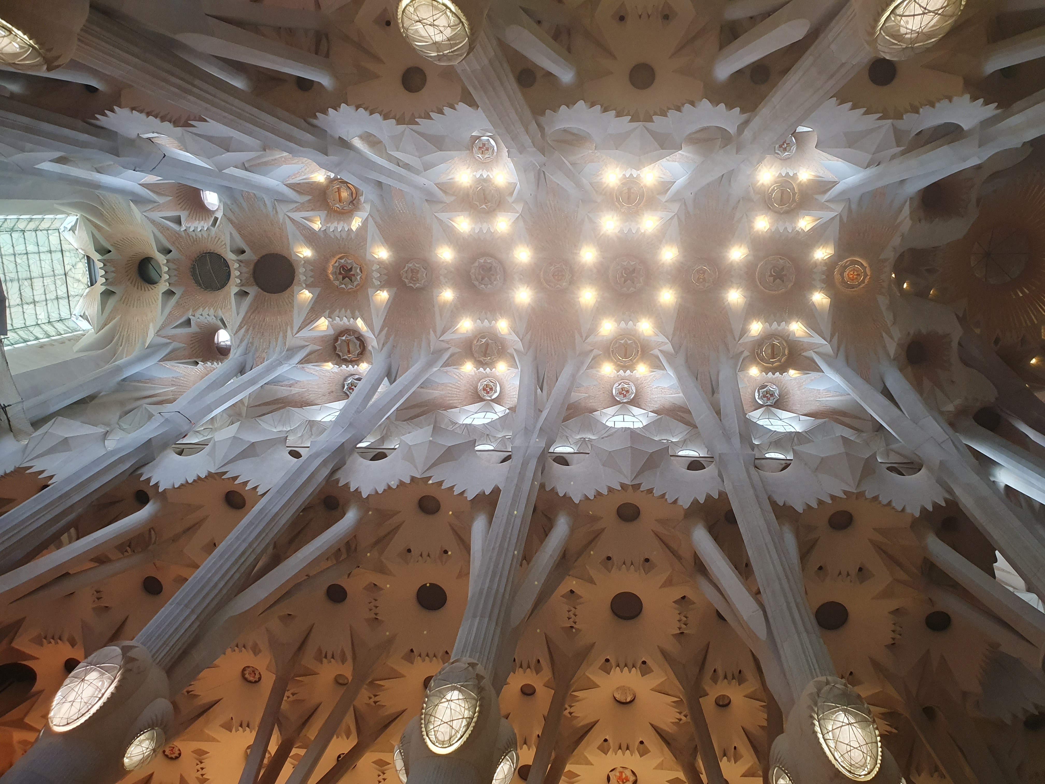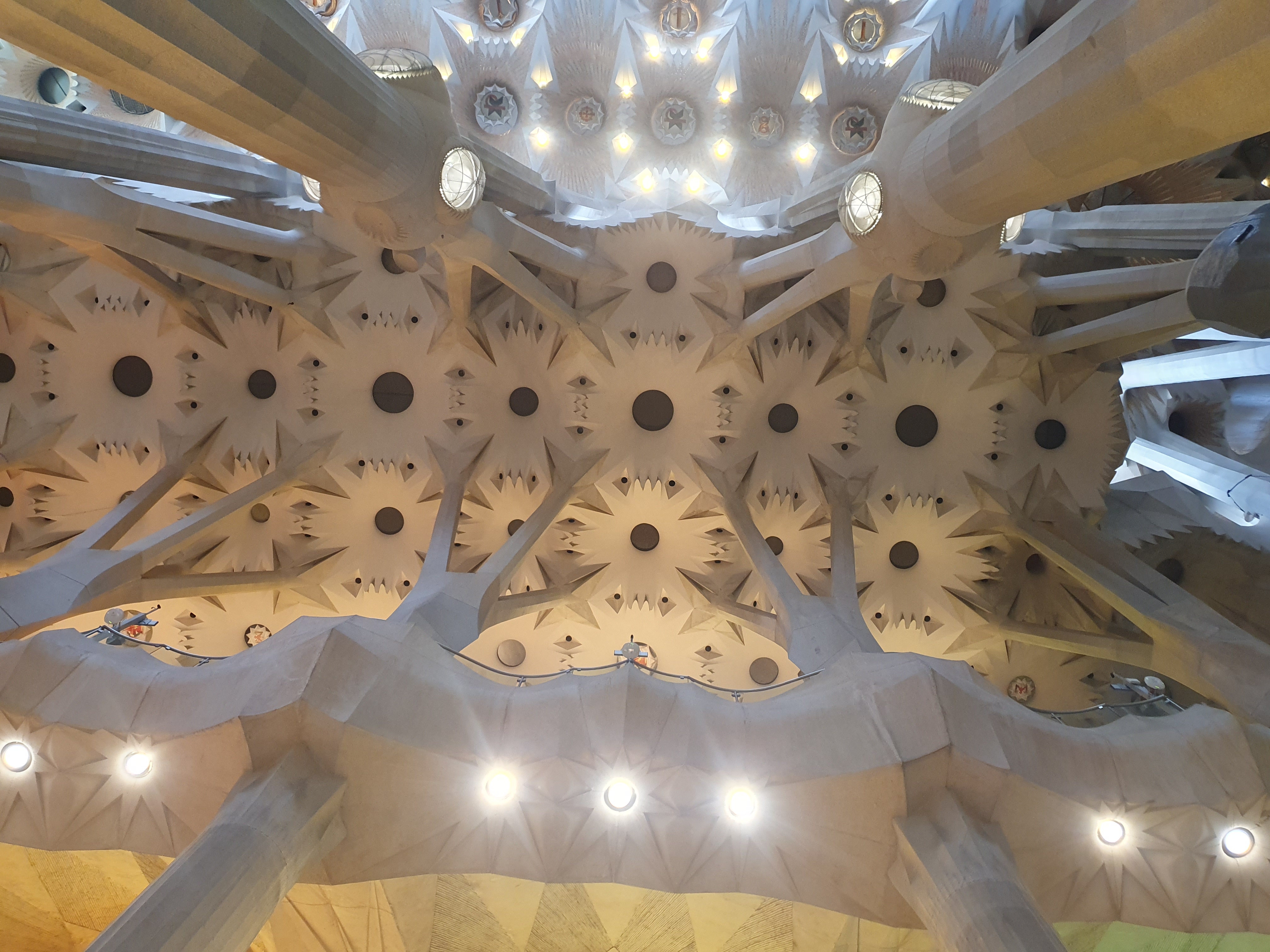 고개를 들어 천장을 보면 정교한 기하학적 무늬들이 보이는데, 가우디는 해바라기나 별 모양을 활용해 천장을 장식했다.