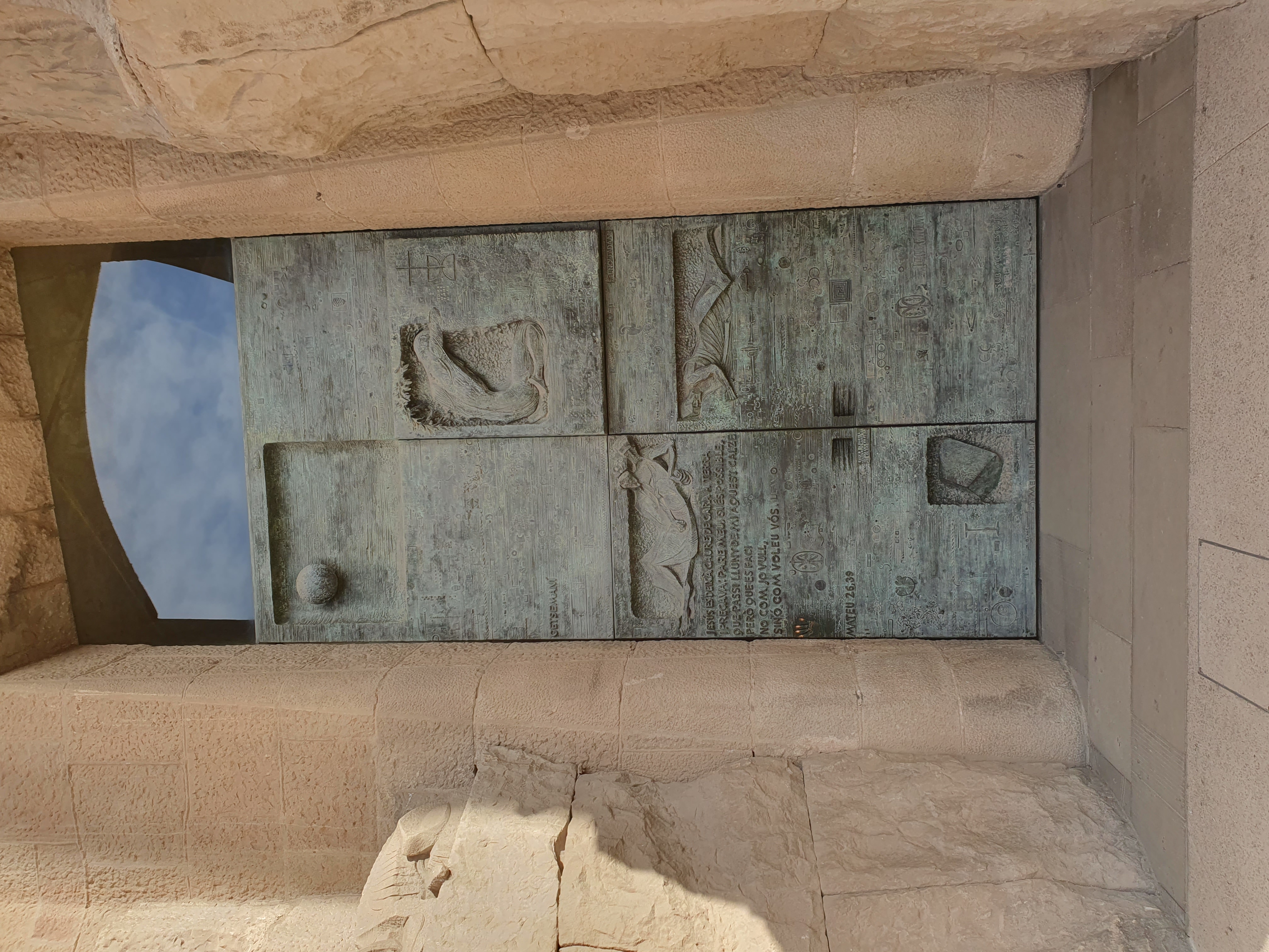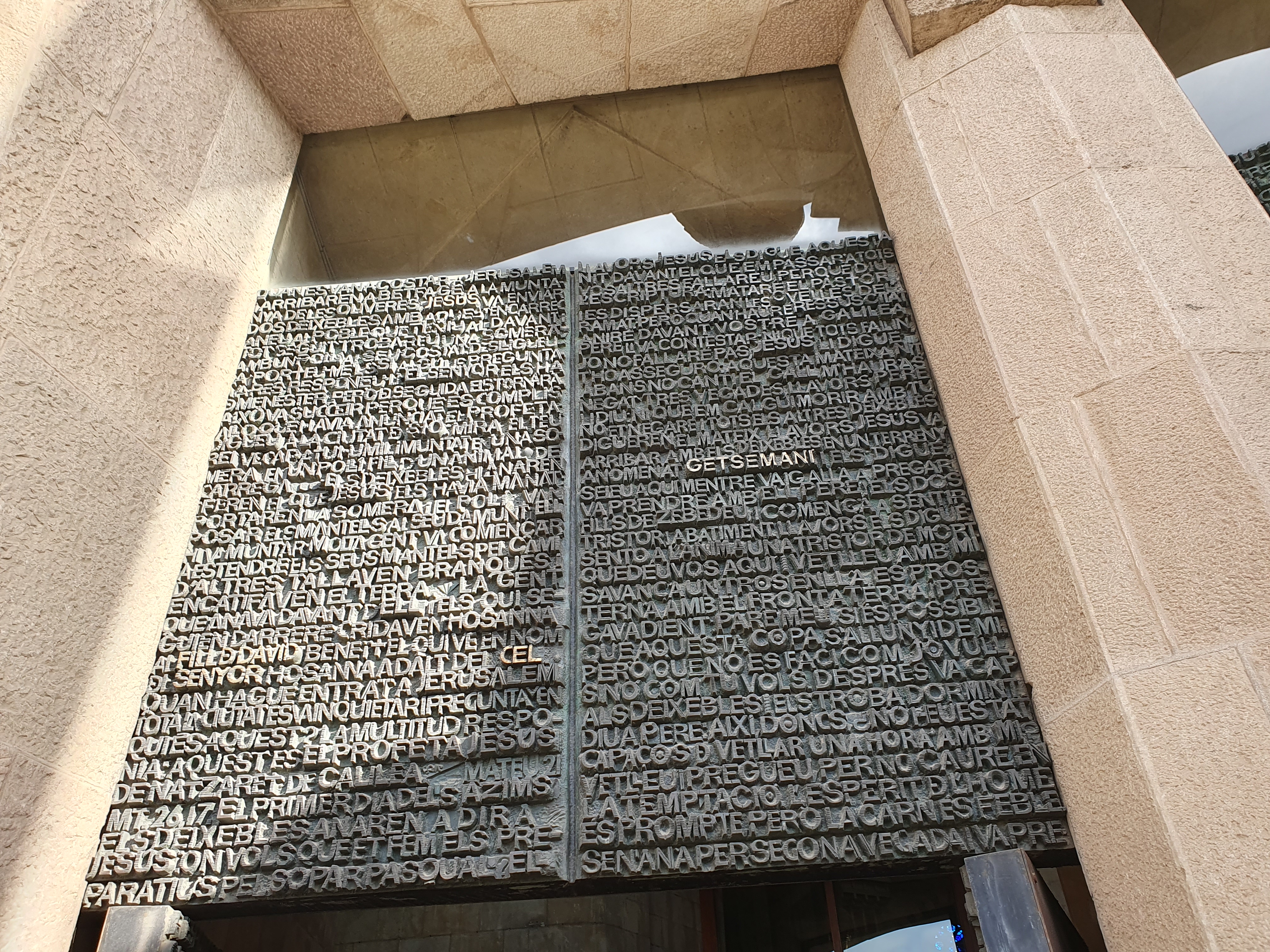 수난의 파사드 쪽 청동문 중 하나입니다. 이 문은 겟세마네 문이라고 불리며, 예수 그리스도의 겟세마네 동산에서의 기도를 묘사하고 있다.