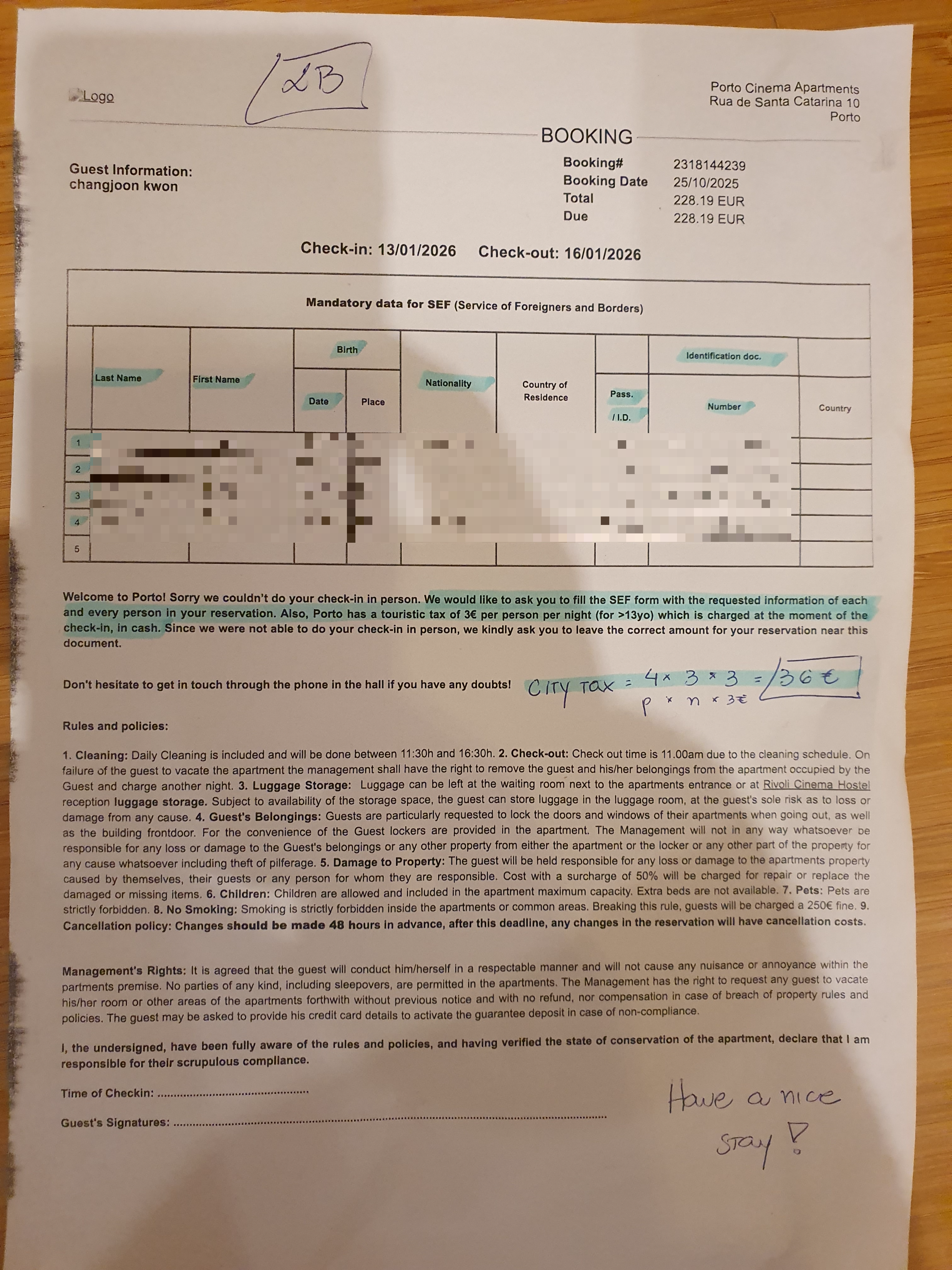 시네마 아파트먼트(Porto Cinema Apartments) 숙소에 도시세 현금으로 놓고 왔다.