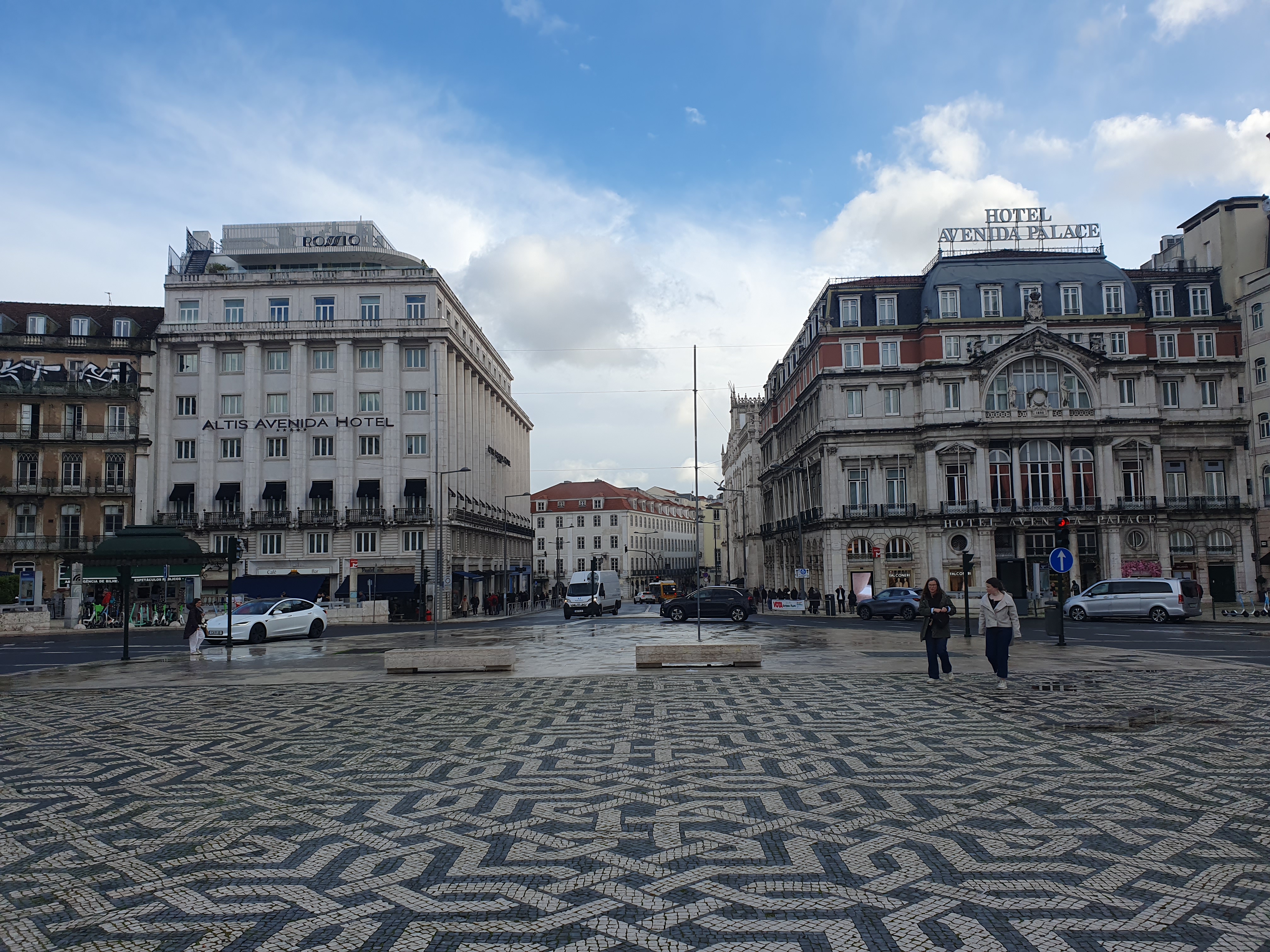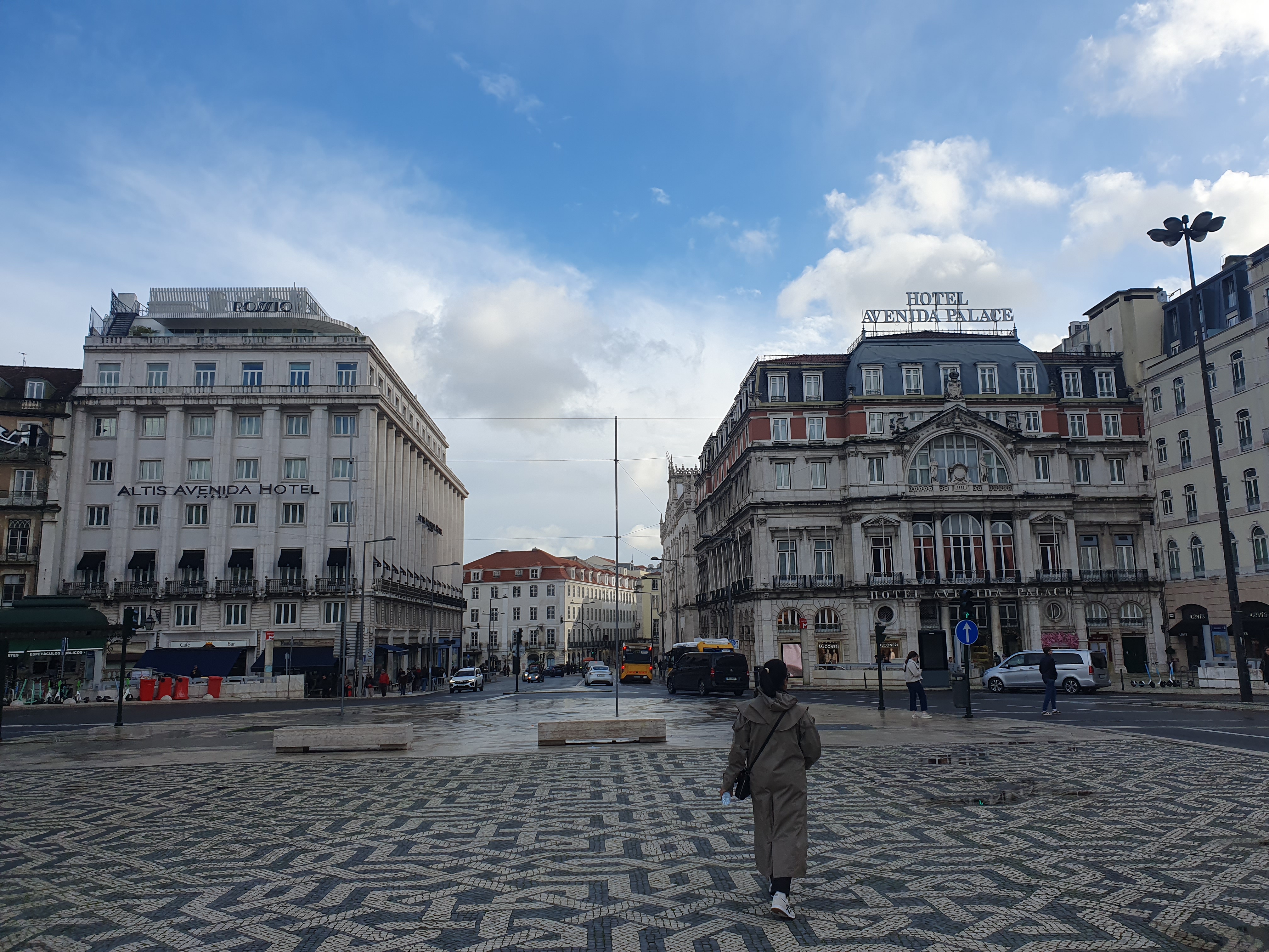 광장 바닥의 독특한 패턴 타일 포장(Calçada Portuguesa)은 리스본의 상징적인 특징 중 하나