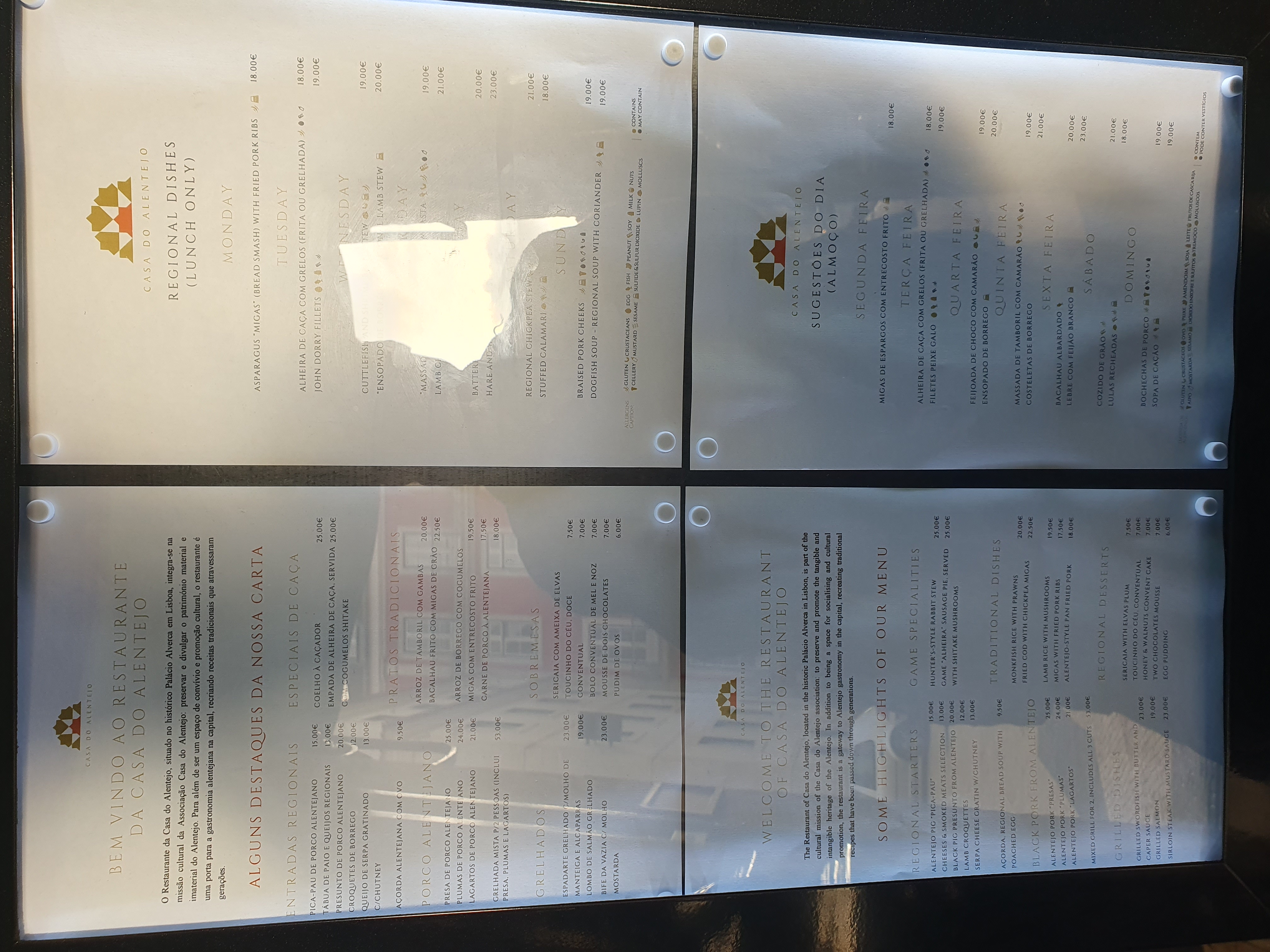 카사 두 알렌테주(Casa do Alentejo) 레스토랑의 메뉴판