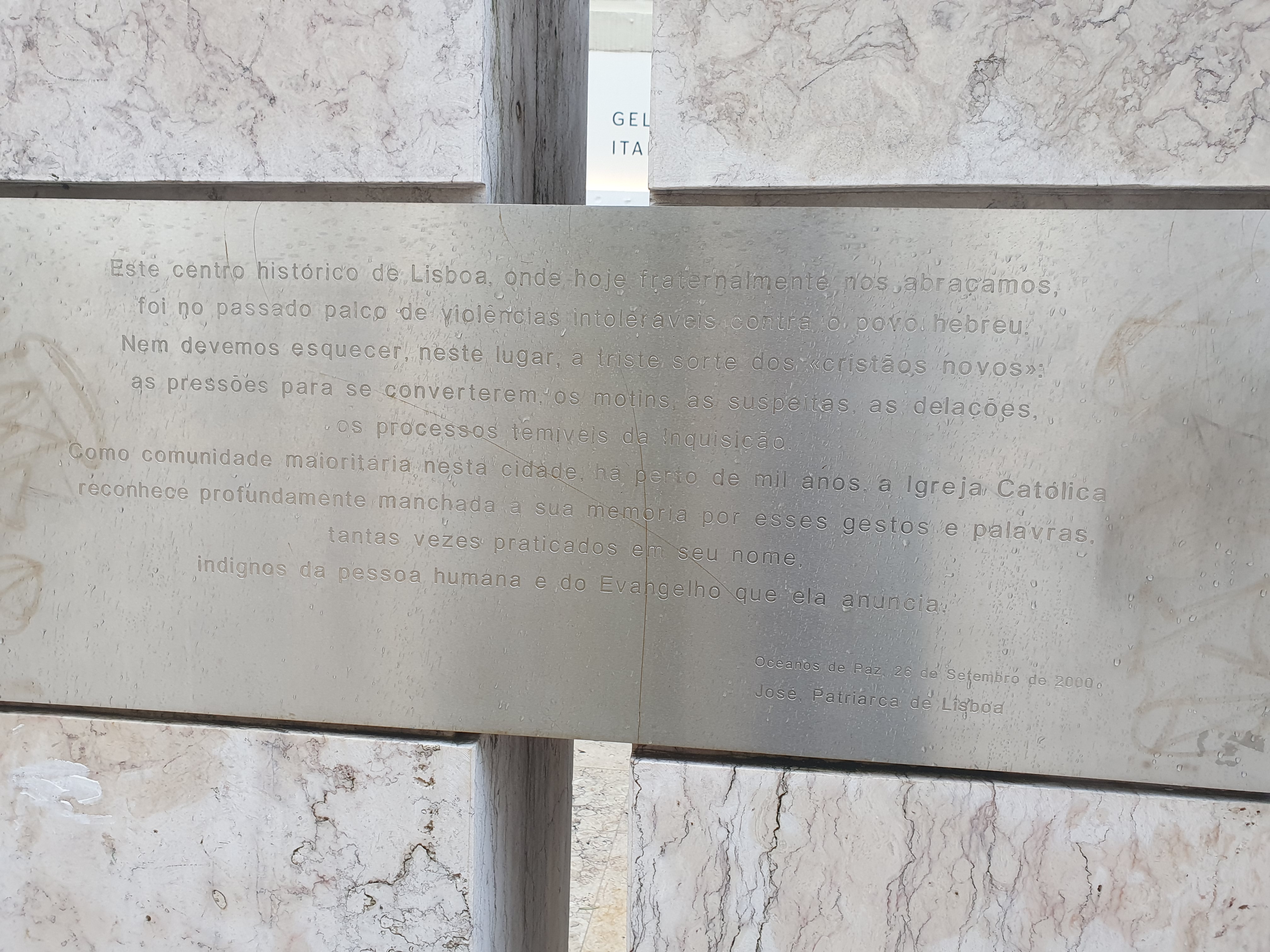 명판에는 "오늘날 우리가 형제처럼 서로를 포옹하는 이 리스본의 역사적 중심지는 과거 유대 민족에 대한 참을 수 없는 폭력의 무대였습니다"는 내용과 함께 가톨릭 교회가 과거의 행동에 대해 깊이 반성하고 있음을 인정하는 내용이 새겨져 있다.