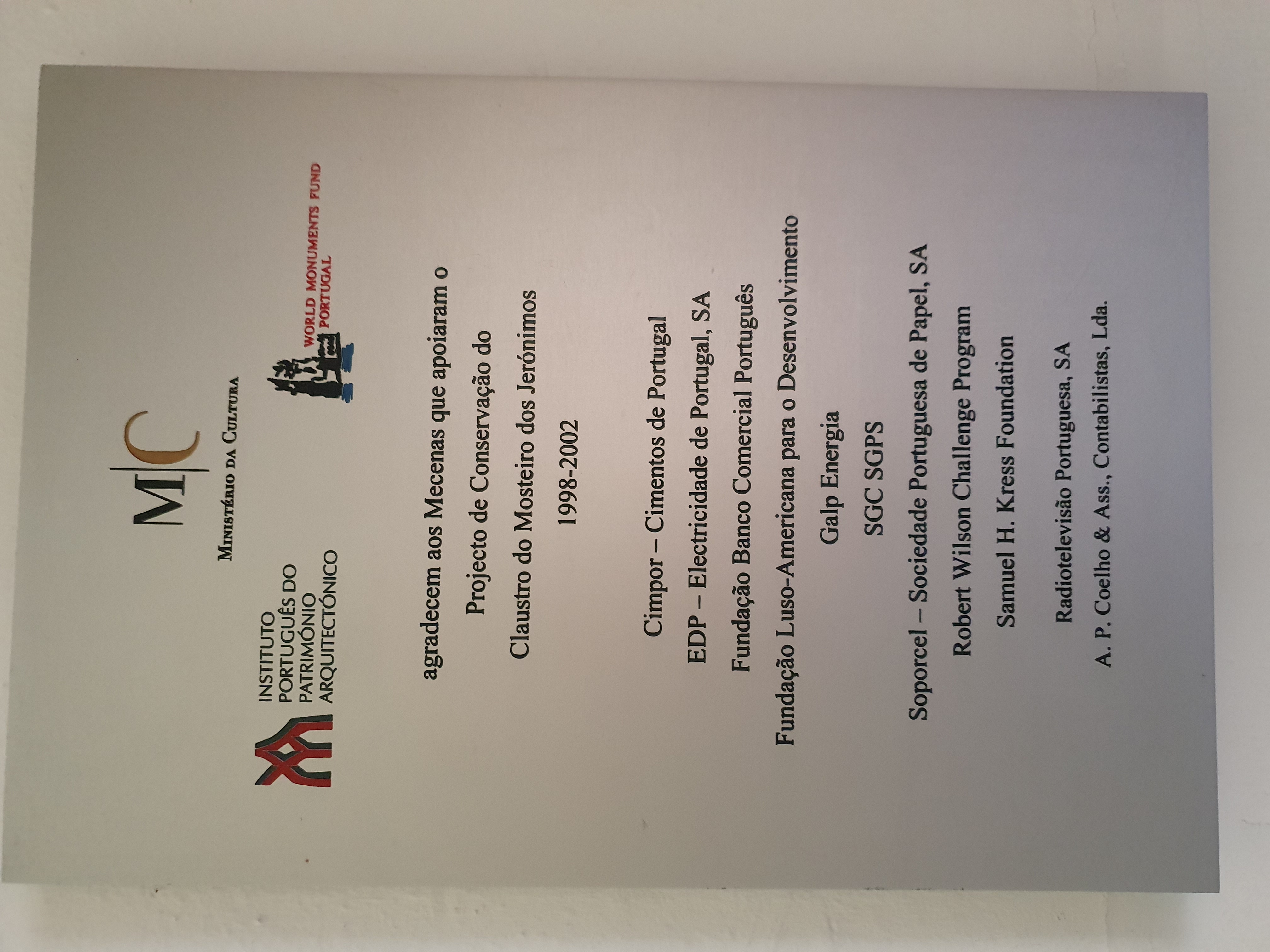 포르투갈 문화부 산하 기관들이 1998년부터 2002년까지 진행된 제로니무스 수도원 회랑 보존 프로젝트에 참여한 후원자들에게 감사를 표하는 내용