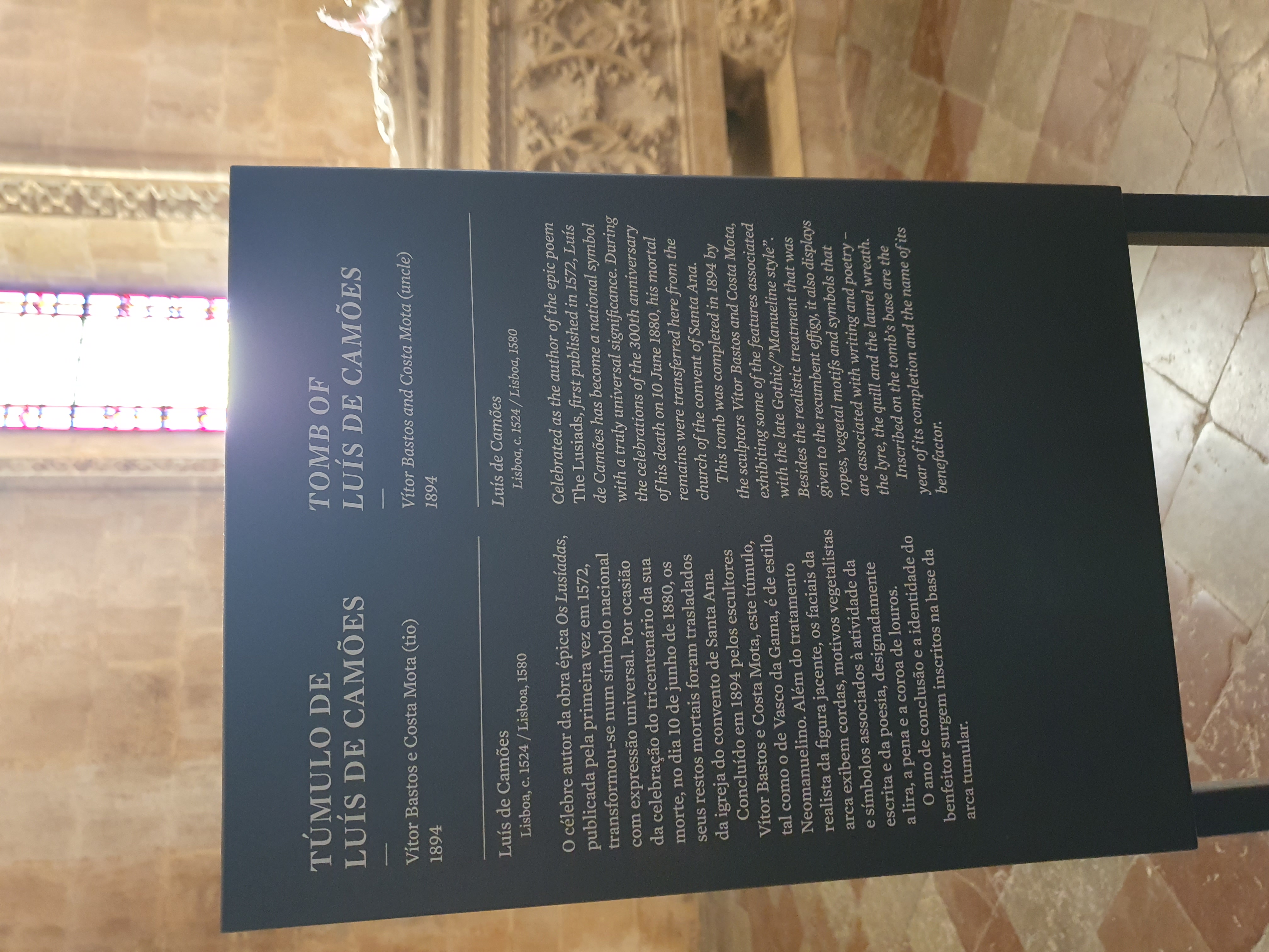 성당 내부에 있는 포르투갈의 위대한 시인 루이스 드 카몽이스(Luís de Camões)의 묘(맞은 편에 바스쿠 다 가마의 묘비가 있다.)