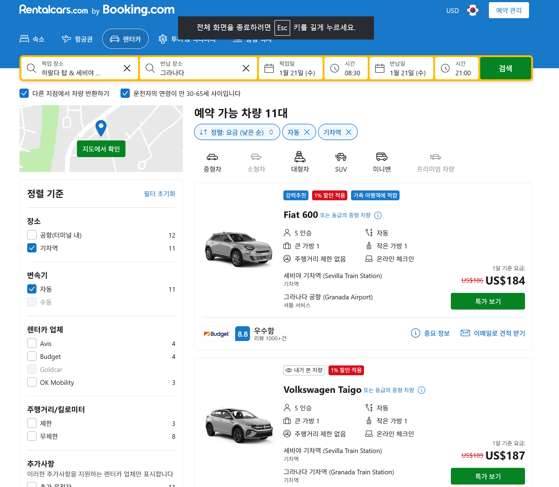 세비야, 그라나다 모두 시내와 가까운 기차역 중 가장 저렴한 차량으로 선택(주행거리 무제한과 자동변속기)