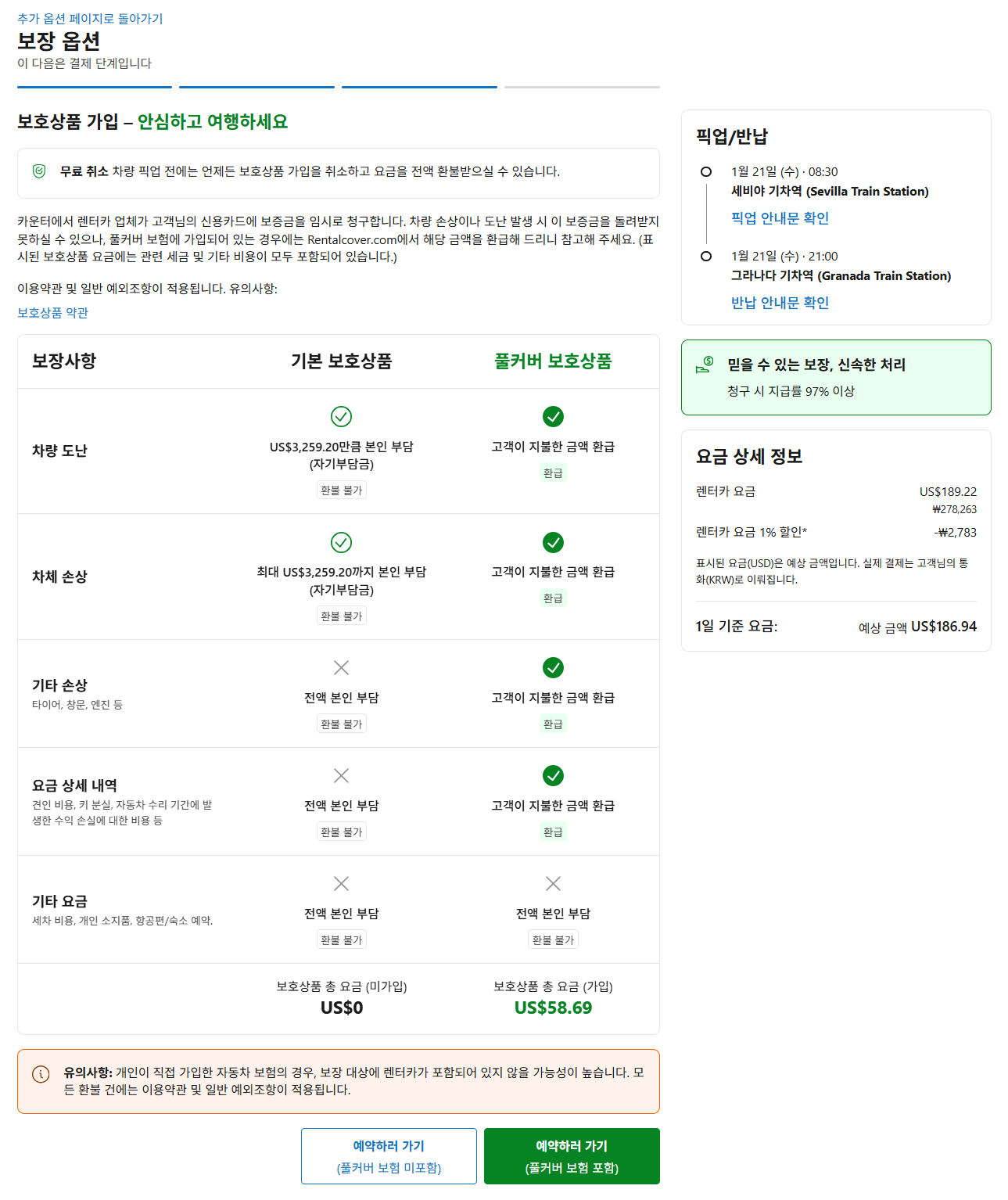 그래서 차라리 렌탈카스닷컴에서 보험없이 차량 예약을 한 후, 차량 픽업시 해당 업체에서 풀커버리지 보험을 가입하는게 더 나을 것 같다.(이러면 사고 발생 시 렌터카 업체에서 알아서 처리하기 때문이다.)