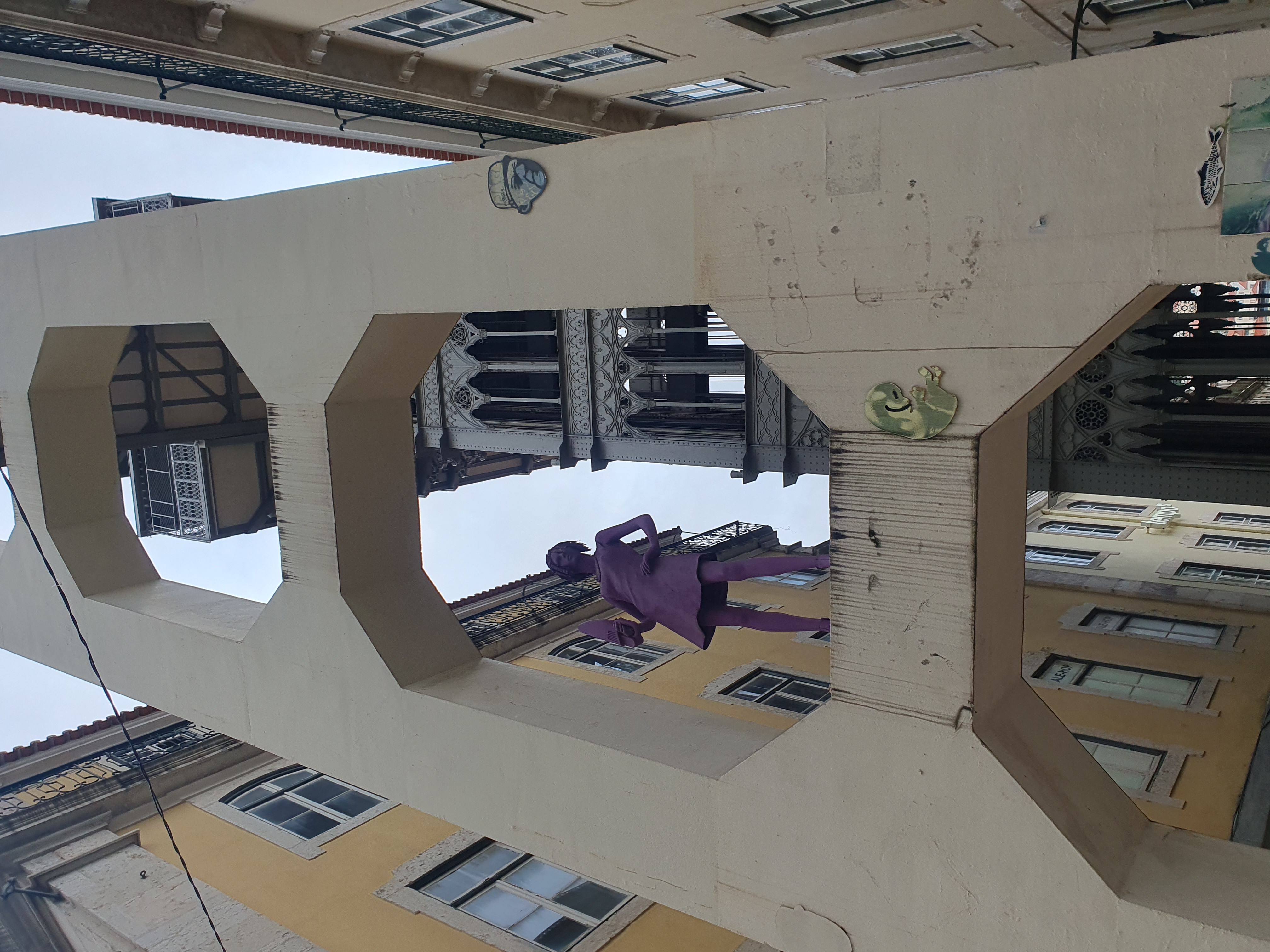 산타 후스타 엘리베이터 바로 뒤편에 있으며, 사진에 보이는 보라색 조형물은 익명의 예술가 '슈퍼리녹스(Superlinox)'의 작품인 '소피아(Sofia)' 조각상
