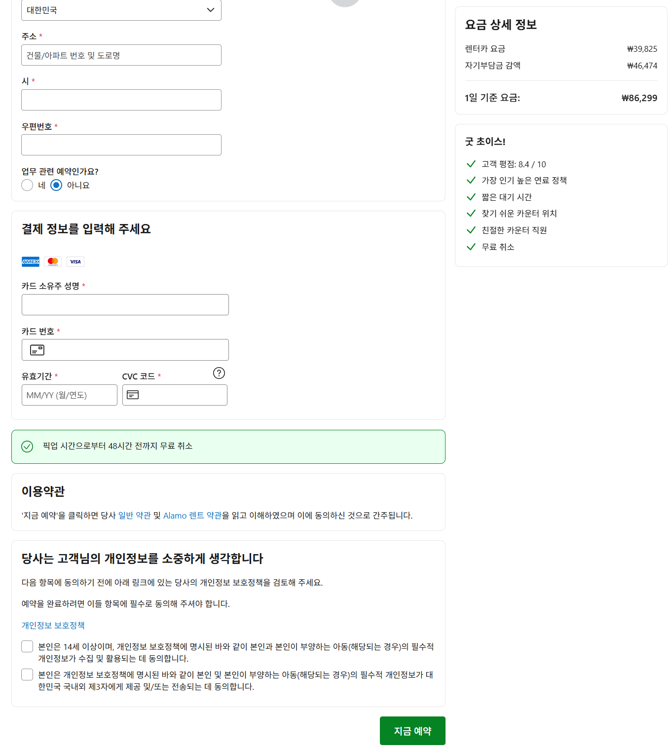 이유는 렌탈카스닷컴에서 보험 가입을 한 후 사고 발생하면 렌터카 업체에 수리 비용을 내가 먼저 지불하고, 렌탈카스닷컴에 후 청구하는 방식인 것 같아 번거로워 보였다.