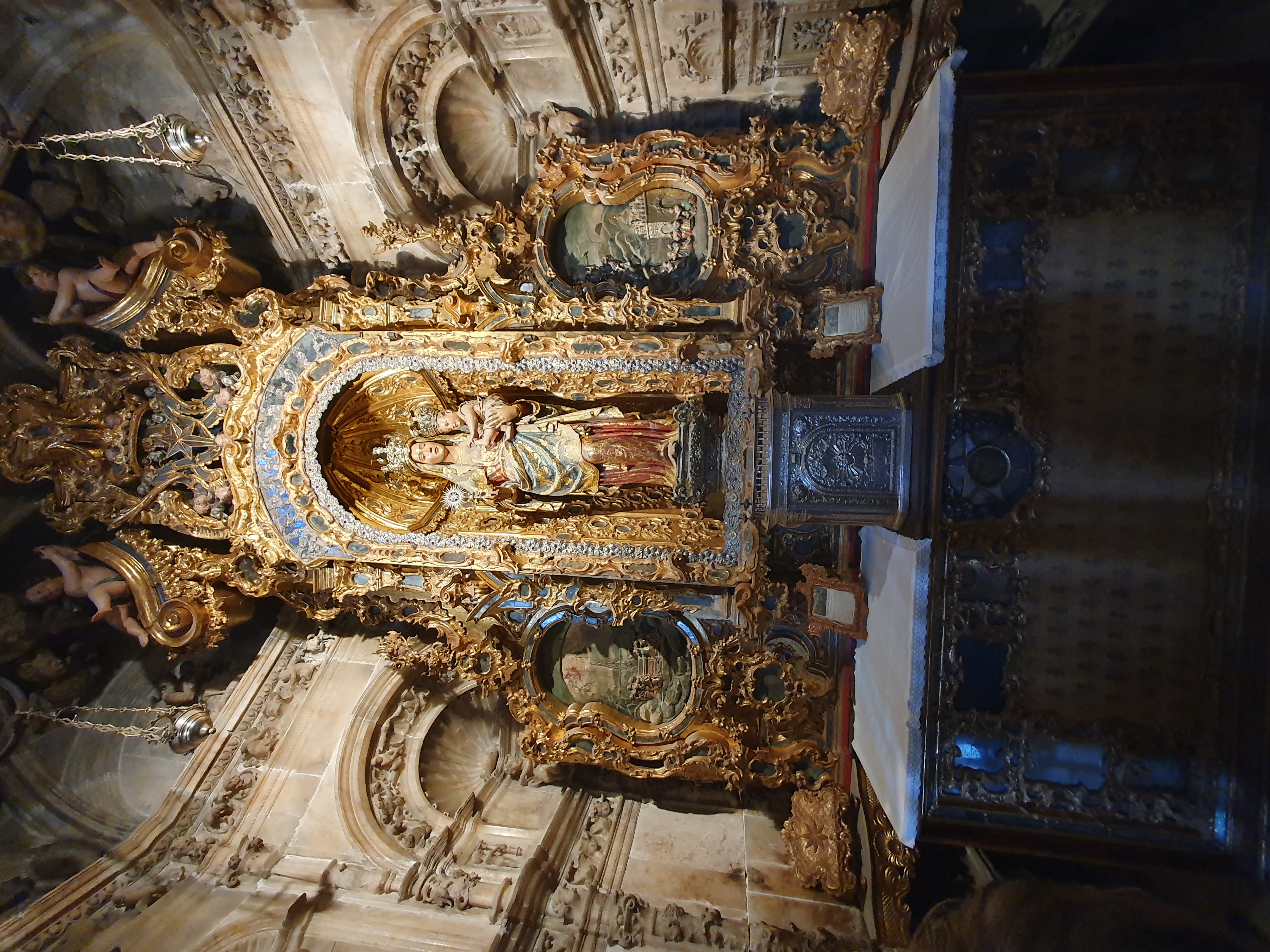 중앙에는 아기 예수를 안고 있는 성모 마리아 조각상이 있으며, 전체적으로 화려한 금박 장식으로 꾸며져 있다.