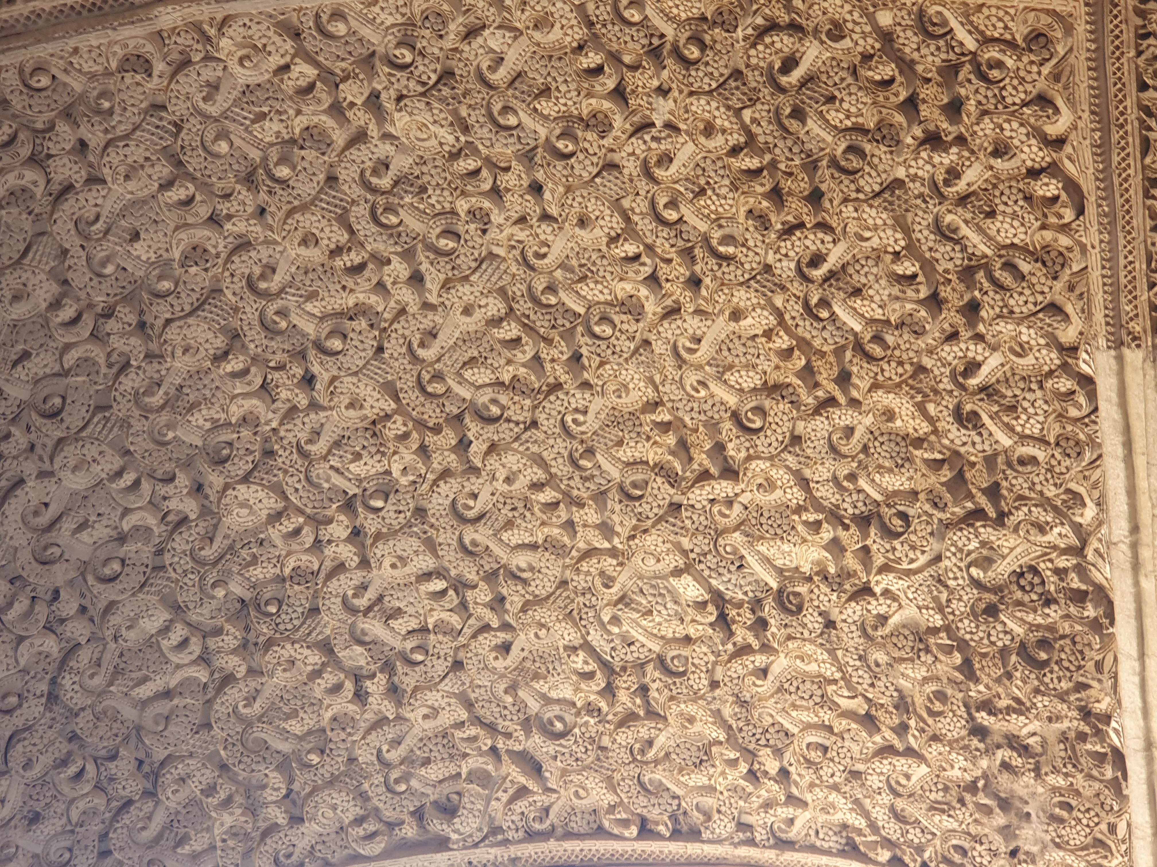 이슬람 건축에서 흔히 볼 수 있는 복잡한 조각된 스투코(stucco) 패턴을 보여줍니다. 이러한 유형의 장식은 특히 모로코와 무어 건축에서 '깁스(gebs)' 또는 스페인어로 '예세리아(yesería)'로 알려져 있으며, 궁전, 마드라사, 모스크 등을 장식하는 데 사용되었다.