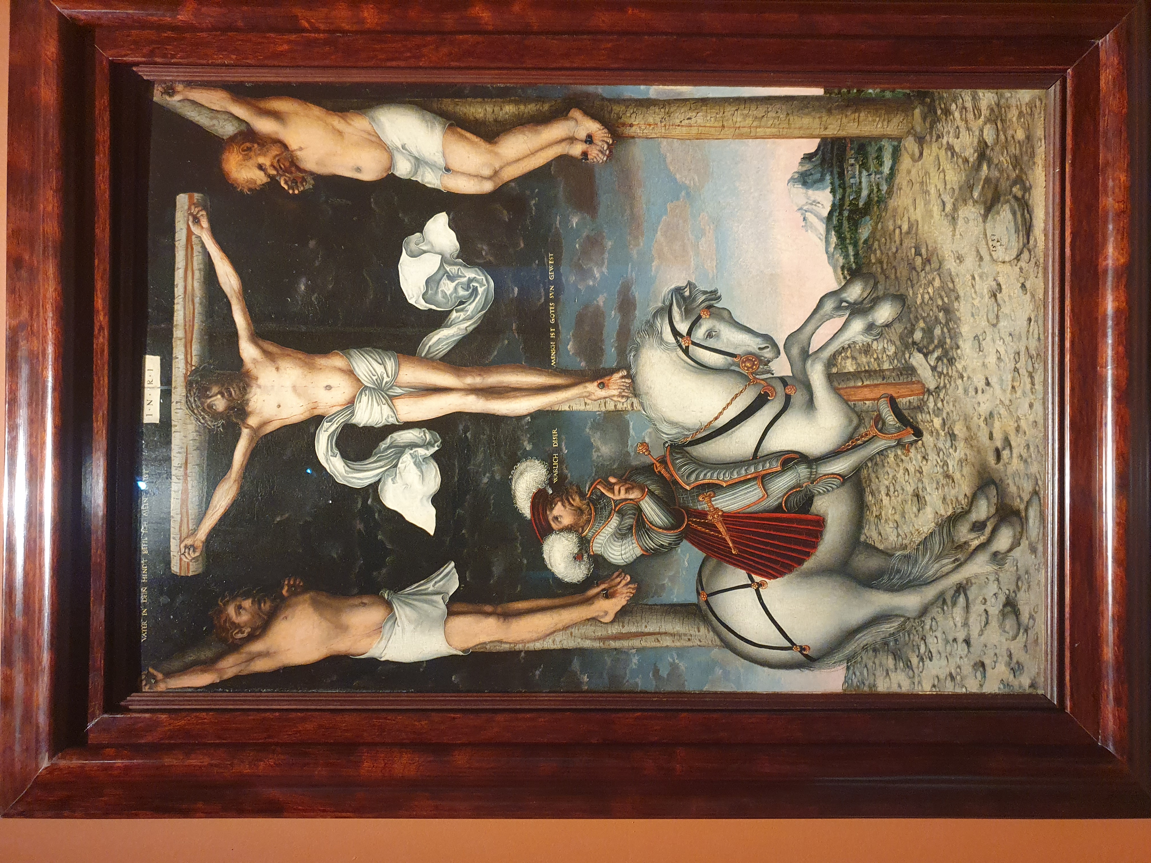 루카스 크라나흐(Lucas Cranach the Elder)가 1538년에 그린 유화 **'골고다 언덕'(Calvary) 또는 '개종한 백부장이 있는 십자가형'(The Crucifixion with the Converted Centurion) 말을 탄 인물은 예수가 십자가에 못 박힌 후 "참으로 이 사람은 하느님의 아들이었다"고 고백한 로마 백부장 롱기누스(Longinus)