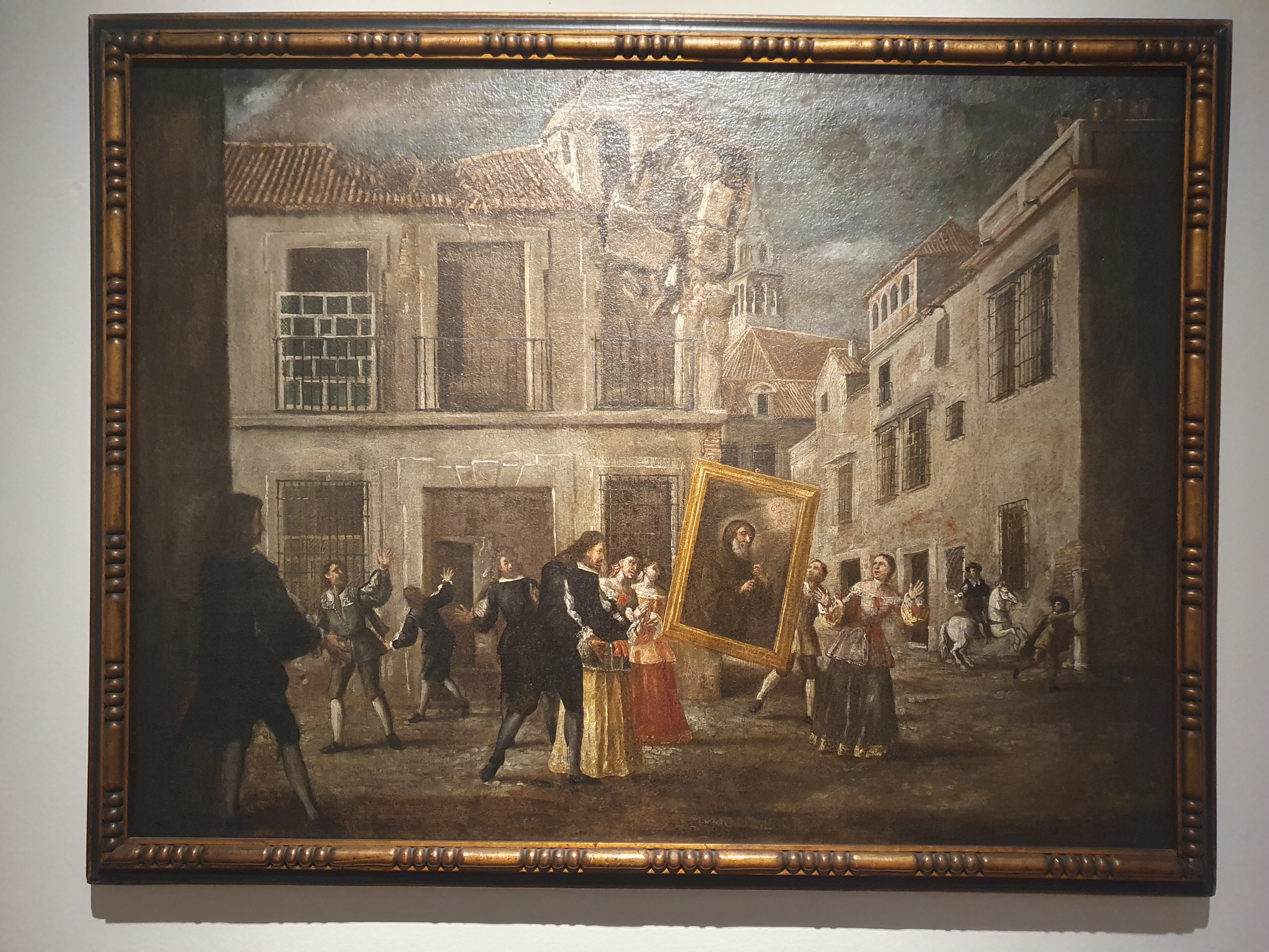 지진이 발생한 도시에서 성 프란치스코 데 파울라의 성화(聖畫)가 기적을 일으켜 지진을 멈추게 한 순간을 묘사하고 있다.