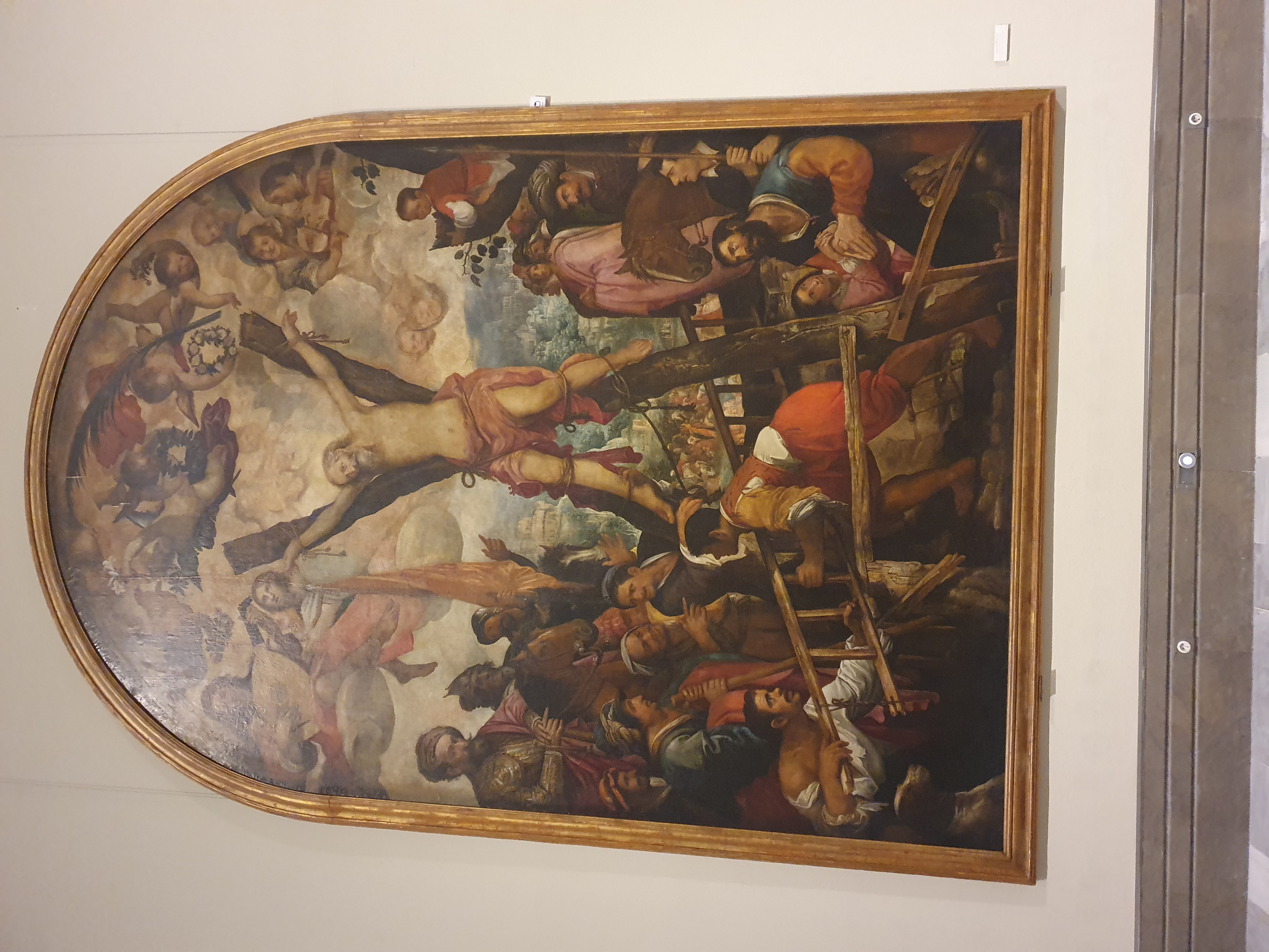 그림은 예수님의 첫 번째 제자 중 한 명인 성 안드레아가 X자형 십자가에 매달려 순교하는 장면을 묘사