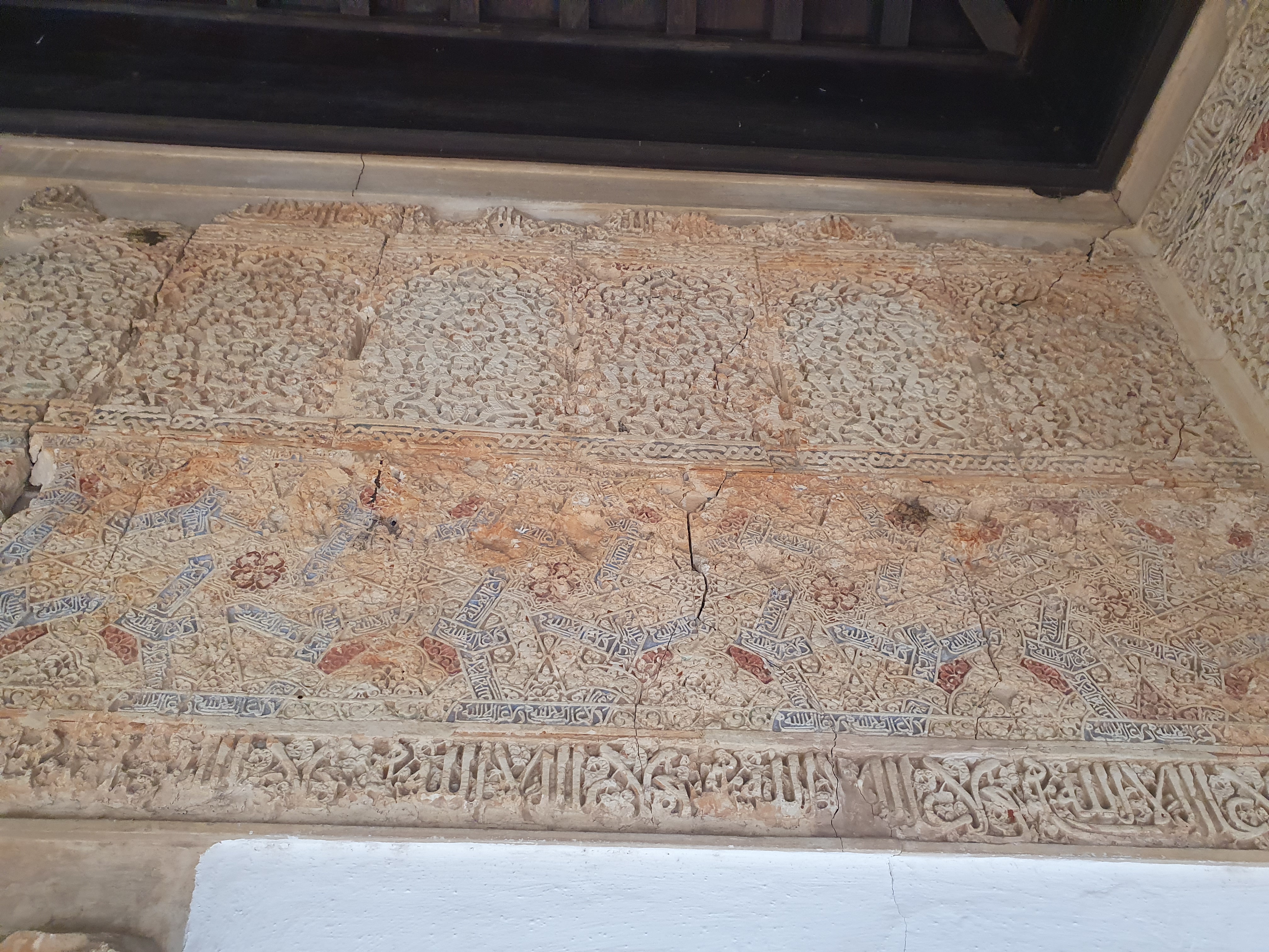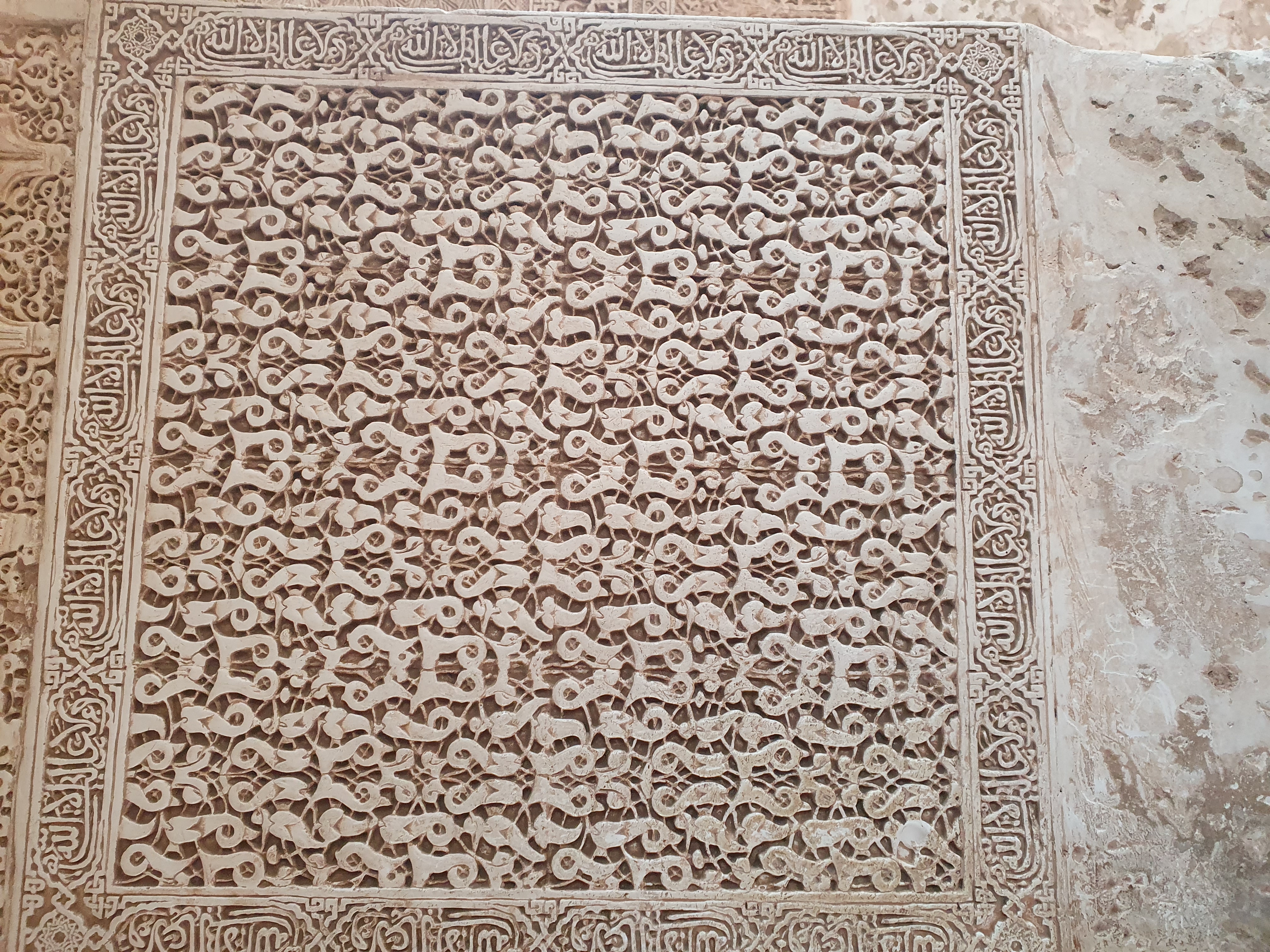3. 아라베스크(Arabesque) 및 치장 벽토(Stucco): 식물 덩굴이나 꽃 모티프를 추상화한 아라베스크 무늬와 정교하게 조각된 치장 벽토가 벽면을 가득 채운다. 벽의 빈 공간을 남김없이 장식하는 것을 중요하게 여겼으며, 이는 '알라 외에 정복자는 없다'는 등의 아랍어 캘리그라피 비문과 조화를 이룬다.