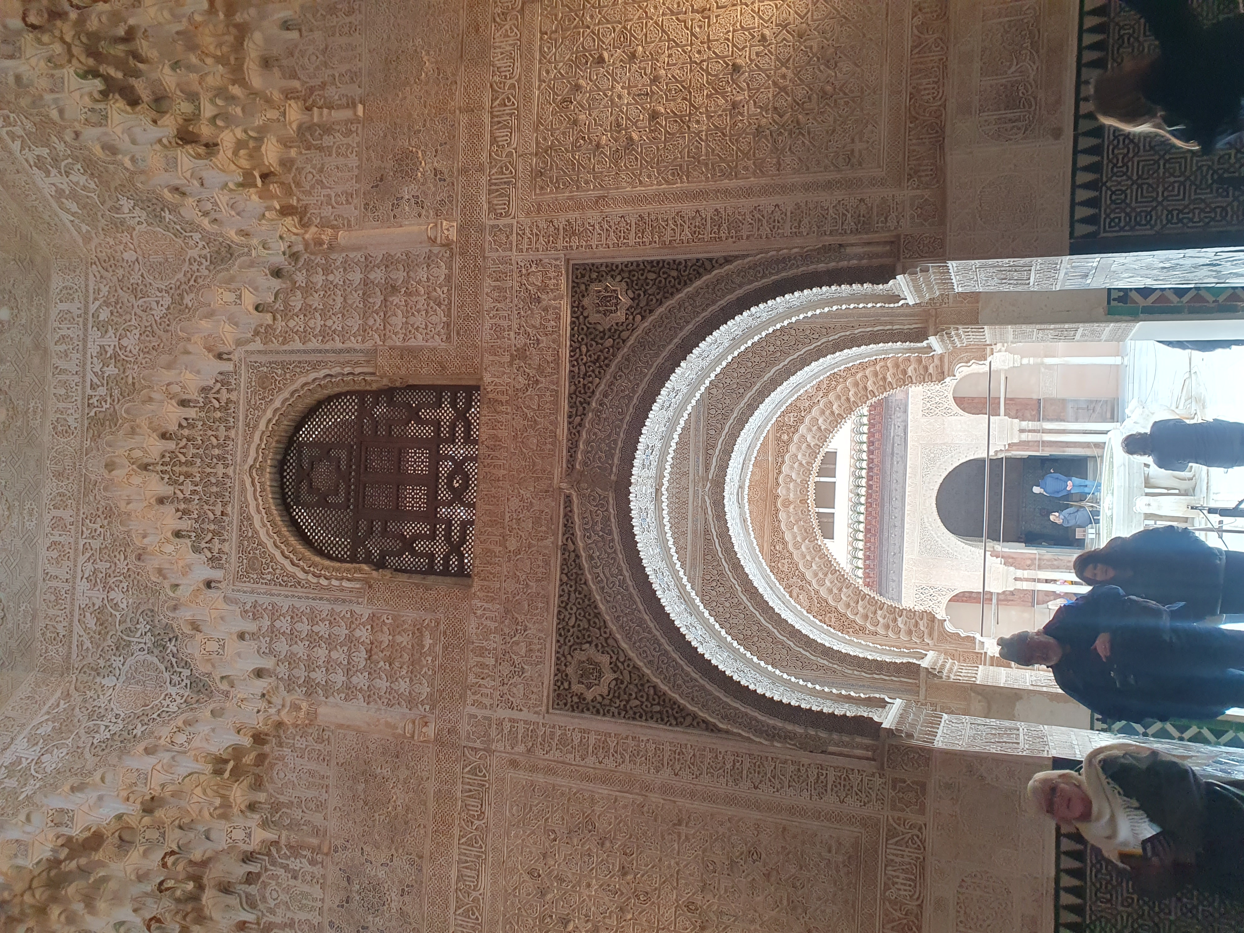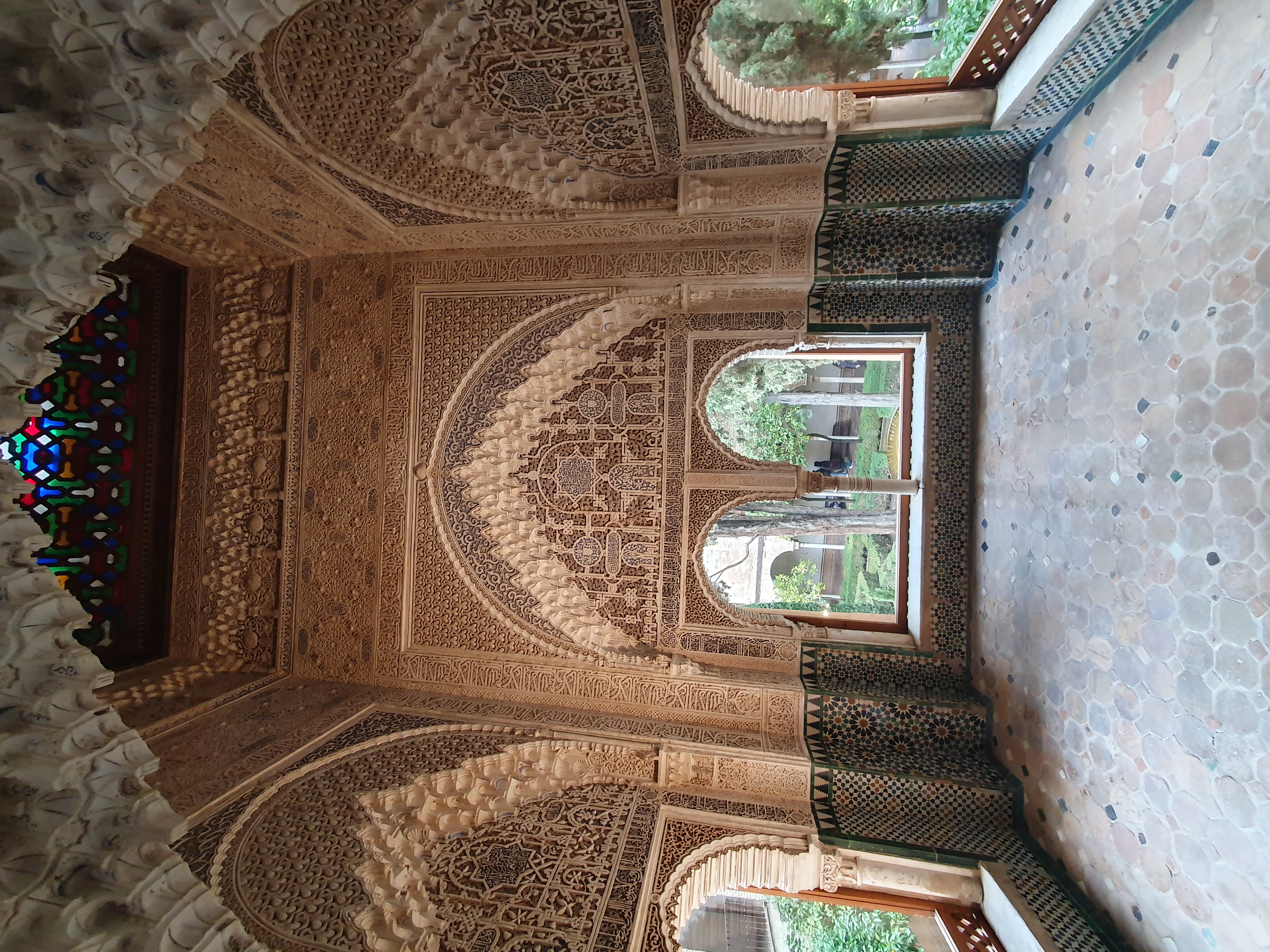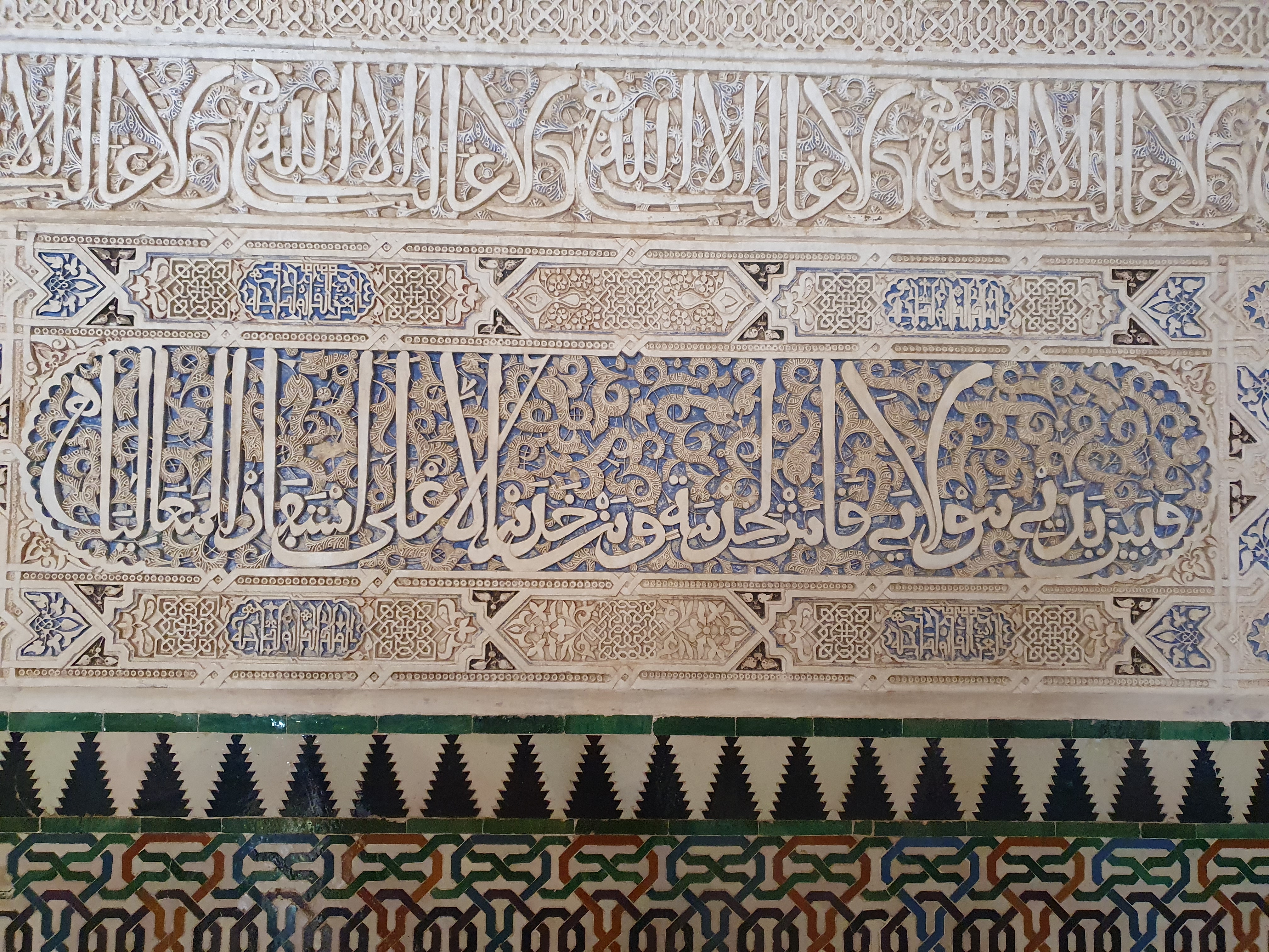 3. 아라베스크(Arabesque) 및 치장 벽토(Stucco): 식물 덩굴이나 꽃 모티프를 추상화한 아라베스크 무늬와 정교하게 조각된 치장 벽토가 벽면을 가득 채운다. 벽의 빈 공간을 남김없이 장식하는 것을 중요하게 여겼으며, 이는 '알라 외에 정복자는 없다'는 등의 아랍어 캘리그라피 비문과 조화를 이룬다.