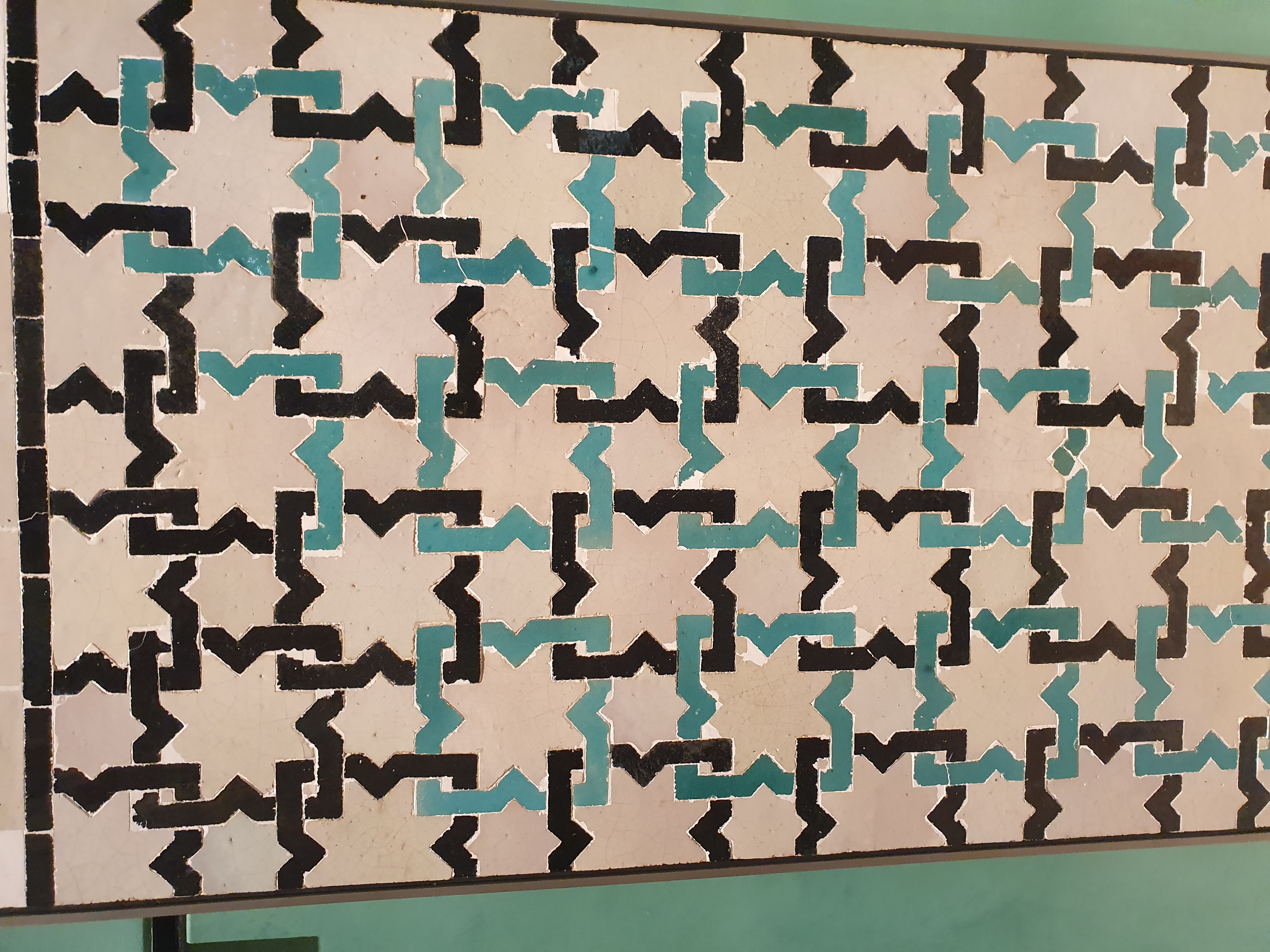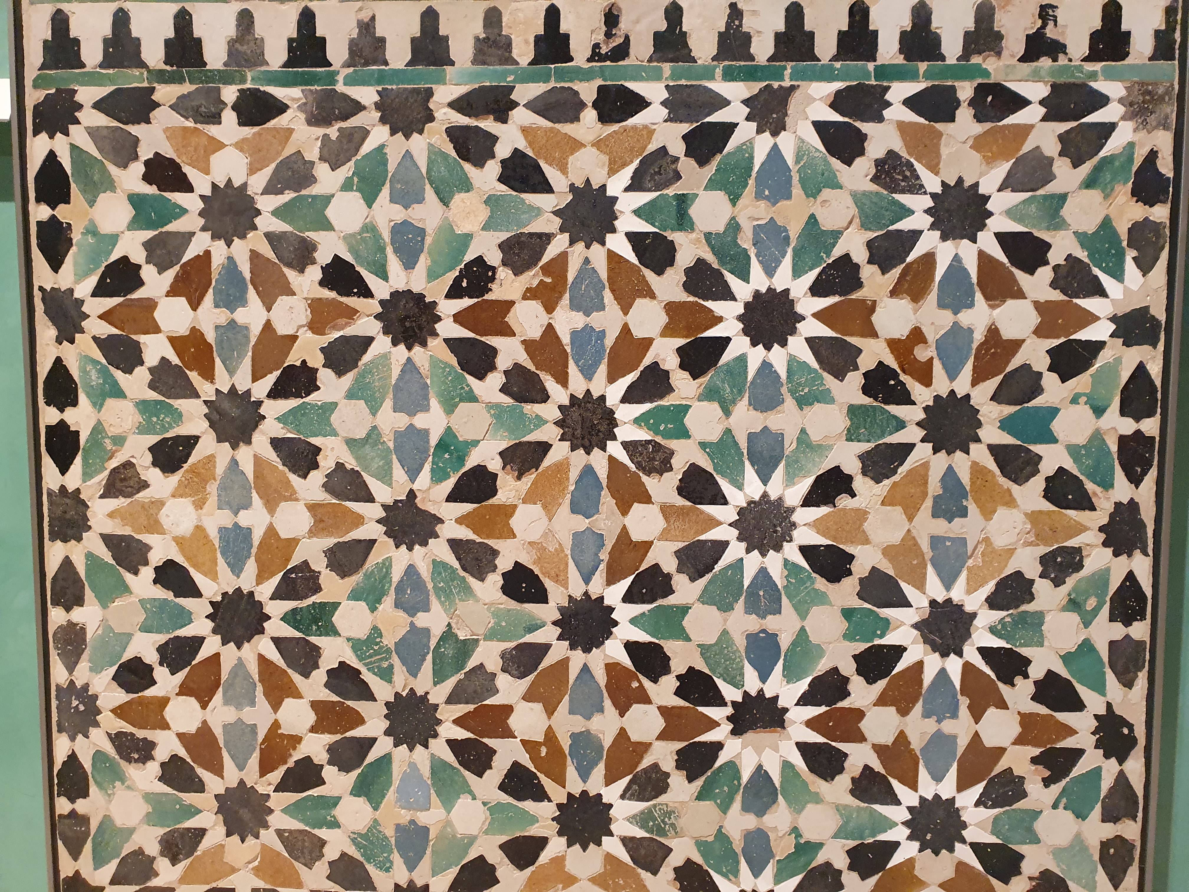 2. 기하학적 패턴 및 타일(Azulejos): 이슬람 예술은 우상 숭배를 금지하므로, 인간이나 동물의 형상 대신 복잡하고 반복적인 기하학적 패턴으로 벽면을 장식했다. 다각형 타일(아줄레호스)을 이용한 장식은 벽의 하단부를 채우며 다채로운 색상과 무한히 반복되는 디자인으로 시각적인 아름다움을 선사한다.