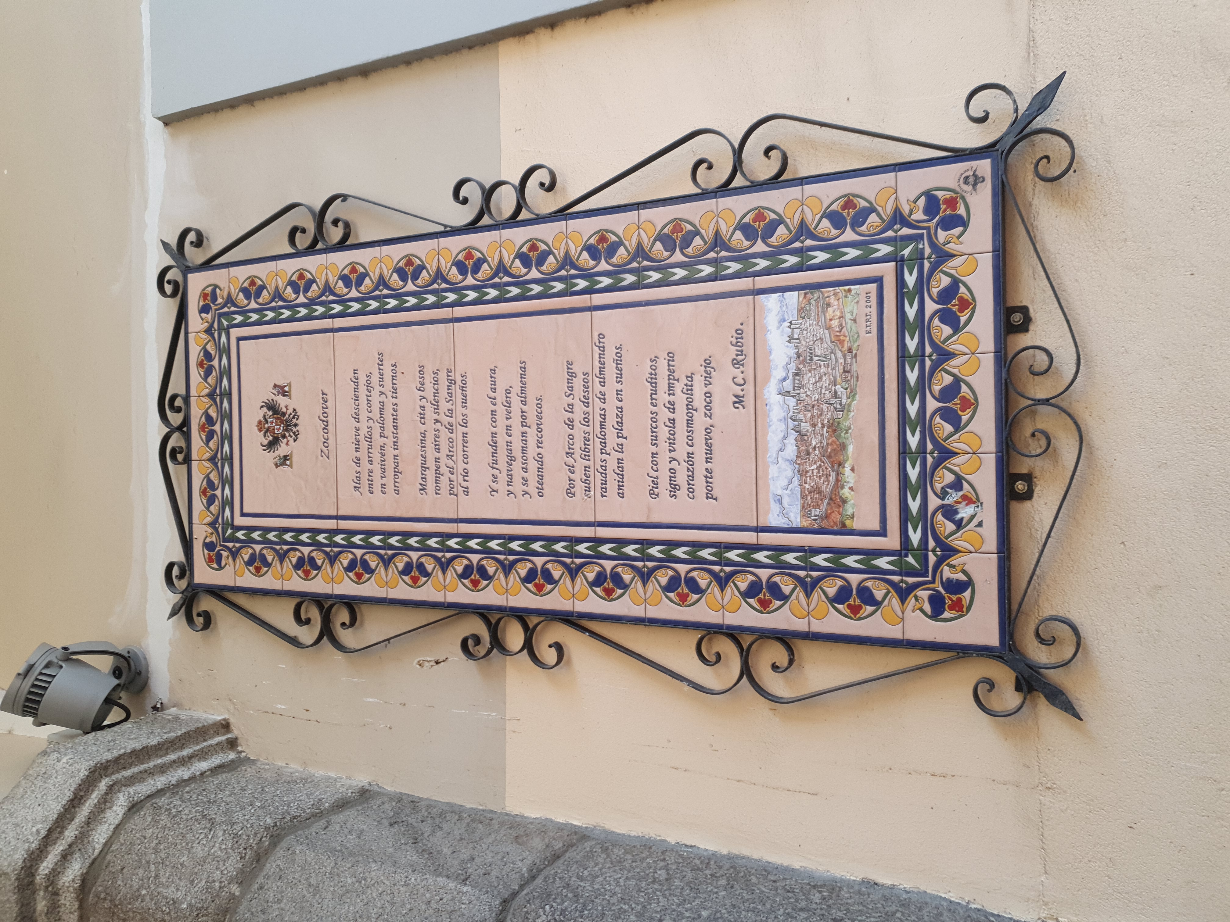 아르코 데 라 상그레(Arco de la Sangre) 아래에 설치된 세라믹 타일 명판으로 시인 M.C. 루비오(M.C. Rubio)의 시가 스페인어로 적혀 있다.