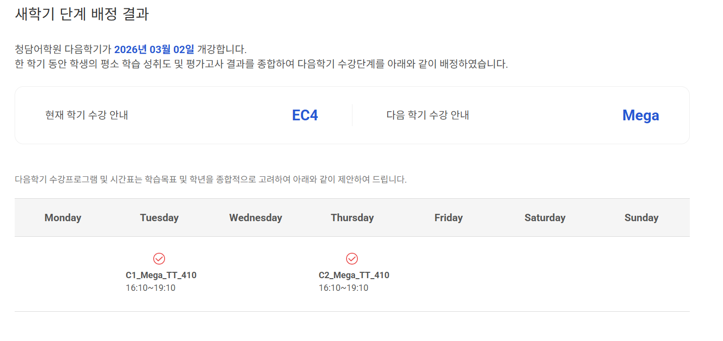 2024.02.22 - [교육/우리집] - 청담어학원 메가(Mega) C1, C2 교재 구매, 레벨표, EC4 F1 정기평가 결과