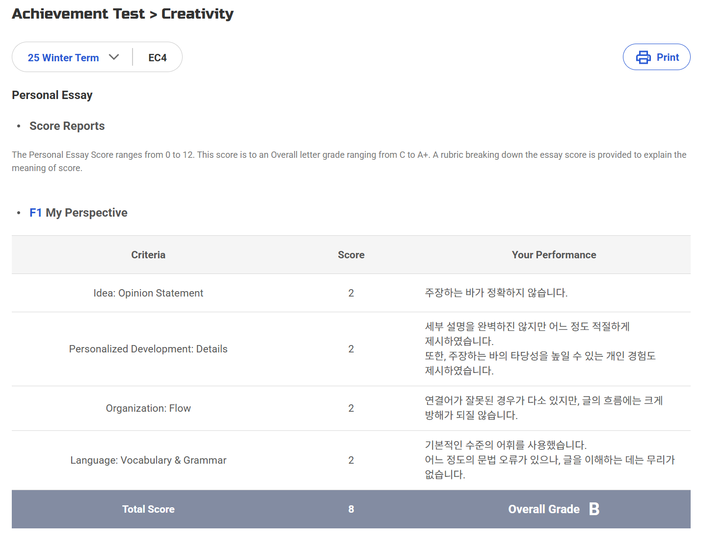 에세이 점수는 'B' 이건 12점 만점 이었지 싶다.