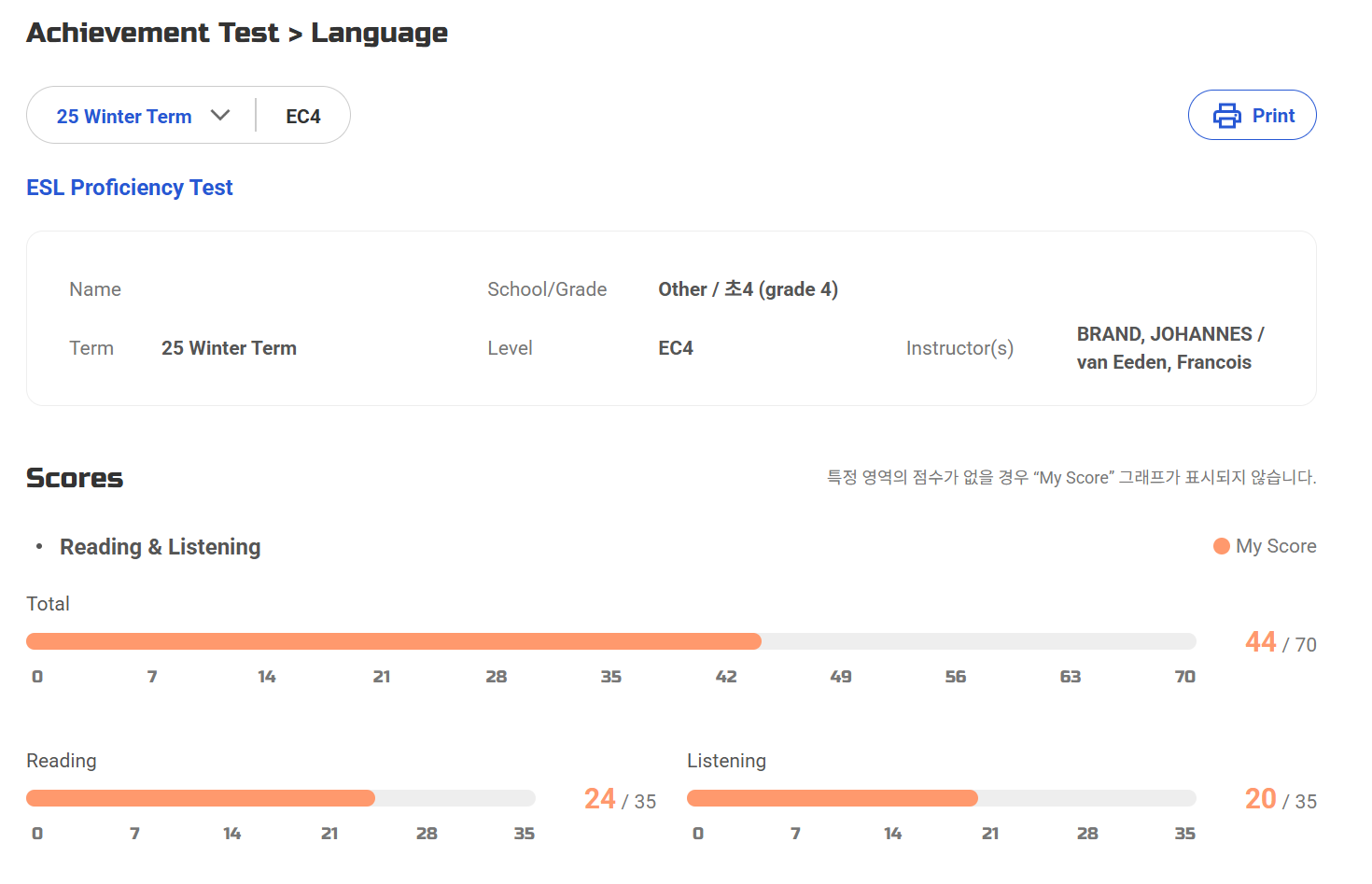 리딩, 리스닝 점수는 44점