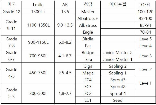 미국 학년, 렉사일지수, AR지수, 청담어학원 레벨, 에이프릴어학원 레벨, 토플 이 비교되어 있다.