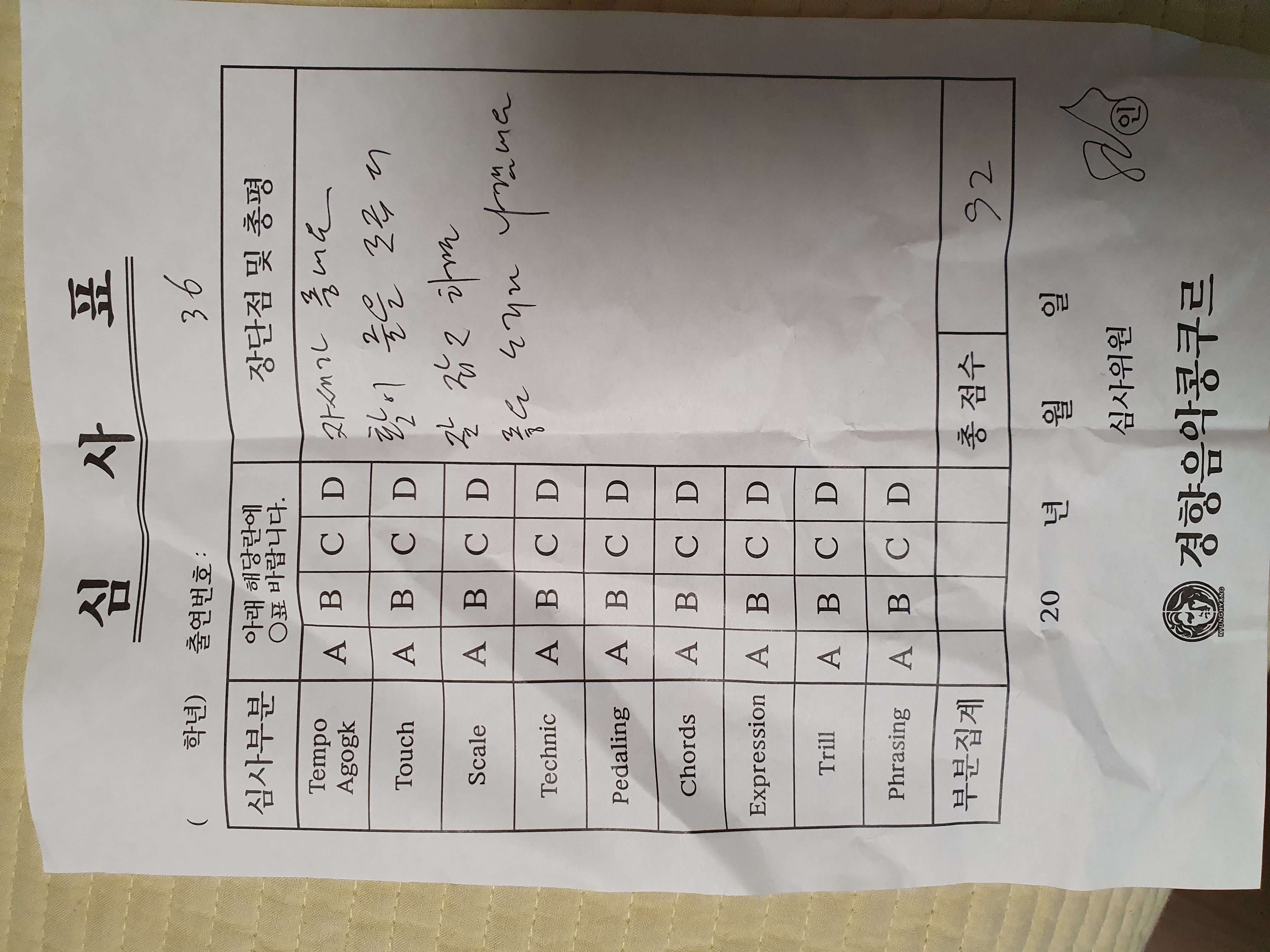 심사표. "자세가 좋네요. 활이 줄을 조금 더 잘 잡고 하면 좋은 소리가 나겠네요."