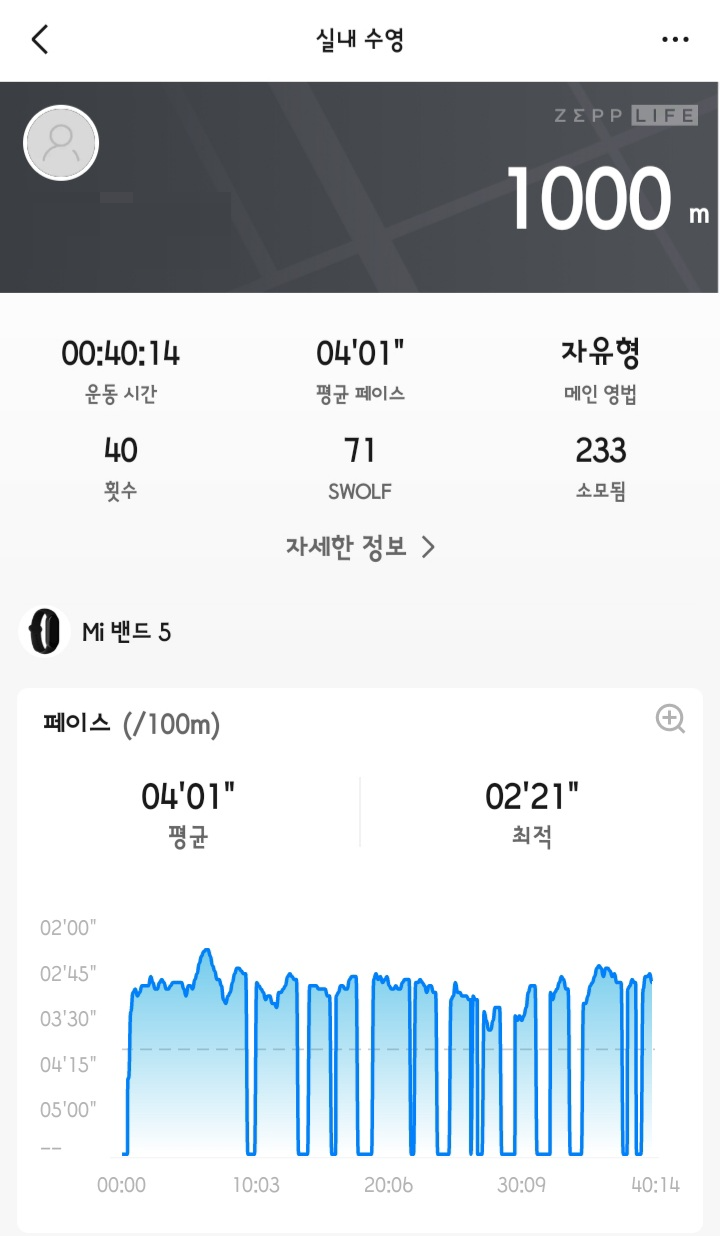 샤오미 미밴드5 수영기록 측정 후 젭라이프(Zepp life) 앱에서 확인